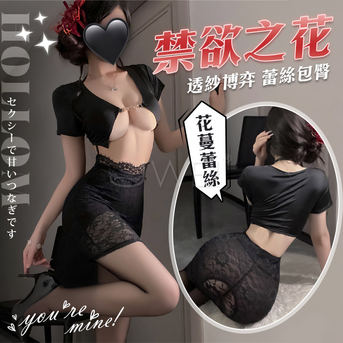禁欲之花.性感開胸露乳花蔓蕾絲透膚包臀輕熟秘書裝【短上衣+連身裙+T褲】