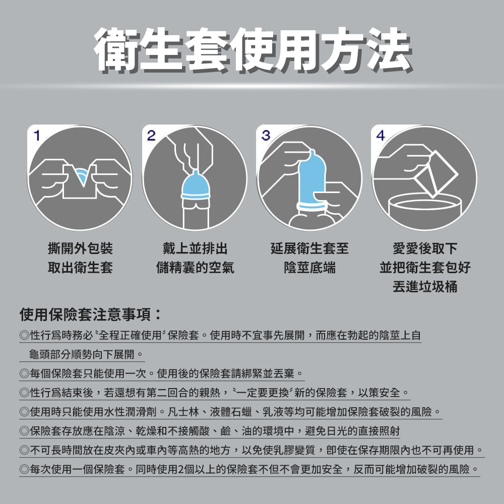 ◎每個保險套只能使用一次。使用後的保險套請綁緊並丟棄。