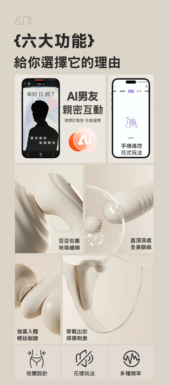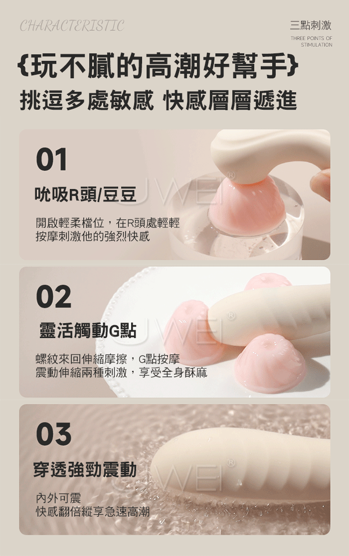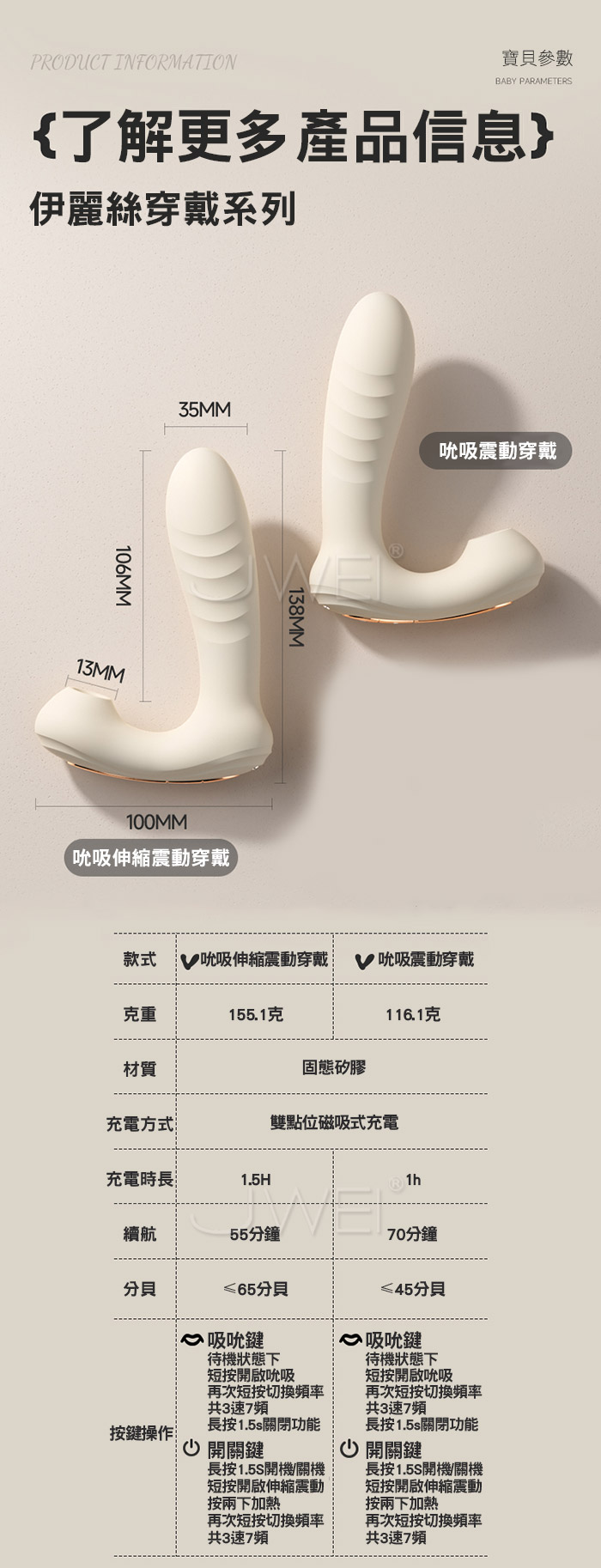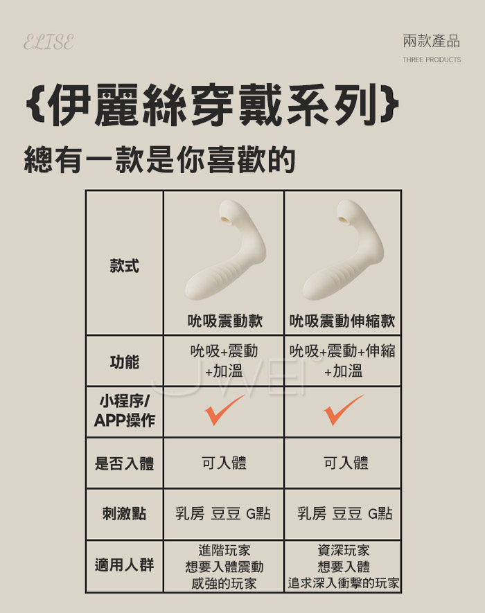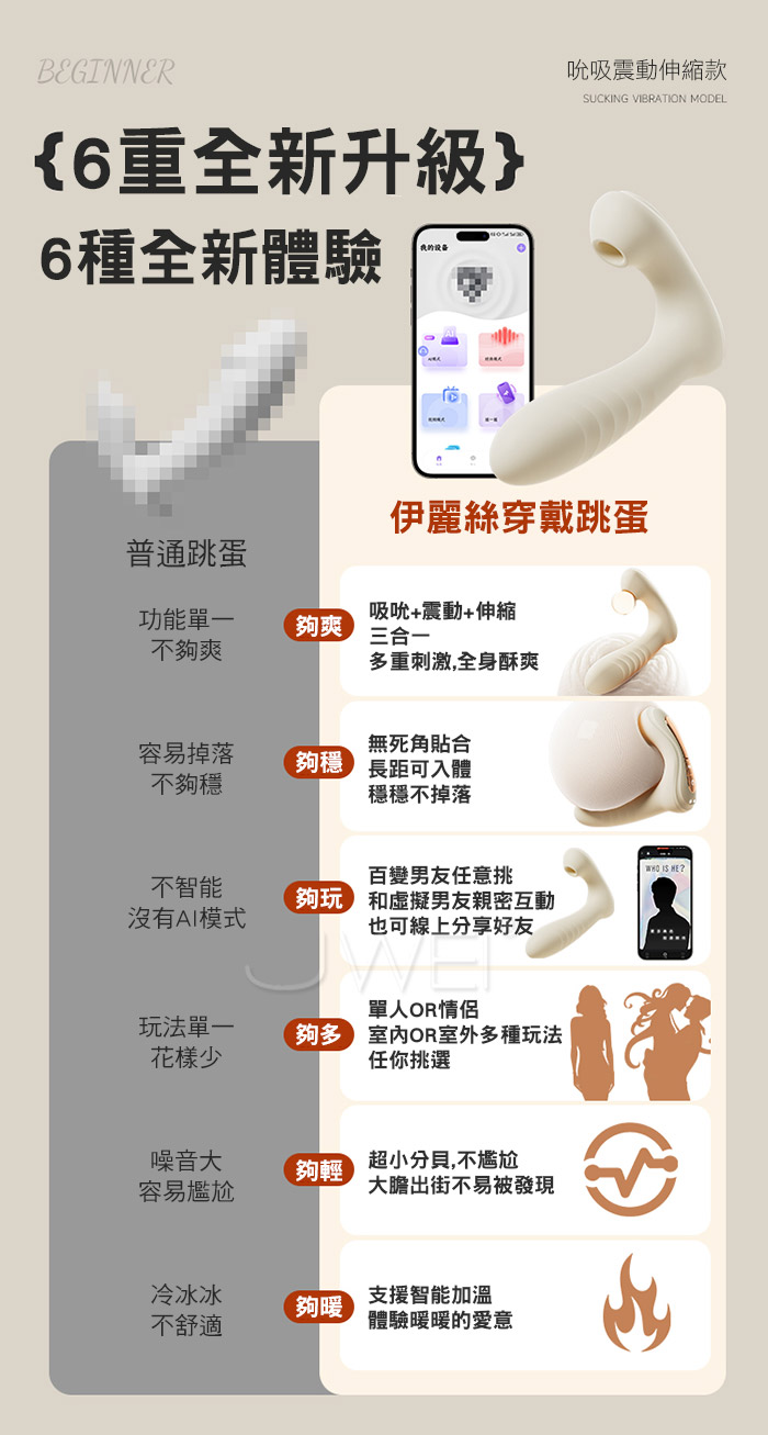 伊麗絲跳蛋,不一樣的穿戴情趣,AI男友親密互動!多樣人設滿足不同幻想~ 吮吸+震動多功能刺激,全身酥爽!無死角貼合密道穩穩不掉落 智能升溫 告別冰冷,暖暖得更貼心,享受更溫暖的愛~ ■尺寸:大小詳如圖片標示 ■材質:矽膠+ABS ■供電:針孔充電 ■特色:10頻吮吸震動、APP智控、加溫