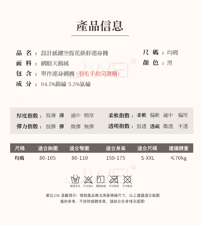 ■內容物:單件連身網衣 ■適穿尺寸:FREESIZE ■彈性:彈 ■未撐開平量尺寸正負誤差1~2cm,1吋=2.54cm ■注意事項:基於保障消費者個人衛生,此貼身衣物恕不接受退換貨。 (如為商品本身暇疵,接受七日內換貨,請勿試穿,謝謝您)