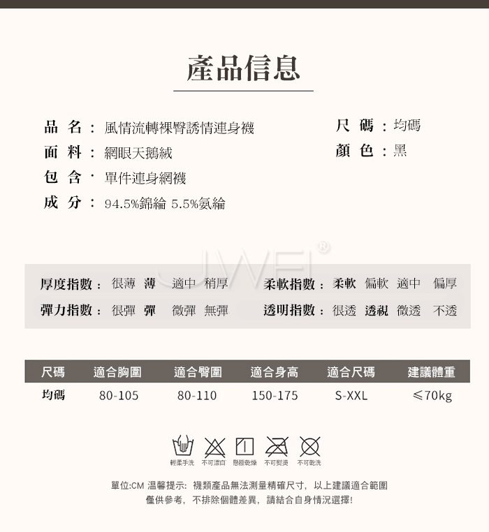 ■內容物:單件連身網衣 ■適穿尺寸:FREESIZE ■彈性:彈 ■未撐開平量尺寸正負誤差1~2cm,1吋=2.54cm ■注意事項:基於保障消費者個人衛生,此貼身衣物恕不接受退換貨。 (如為商品本身暇疵,接受七日內換貨,請勿試穿,謝謝您)
