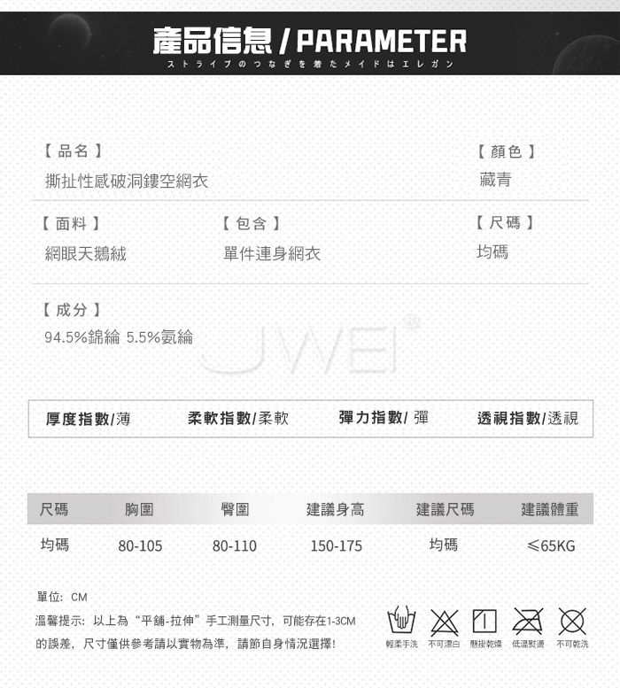 ■內容物:單件連身網衣 ■適穿尺寸:FREESIZE ■彈性:彈 ■未撐開平量尺寸正負誤差1~2cm,1吋=2.54cm ■注意事項:基於保障消費者個人衛生,此貼身衣物恕不接受退換貨。 (如為商品本身暇疵,接受七日內換貨,請勿試穿,謝謝您)