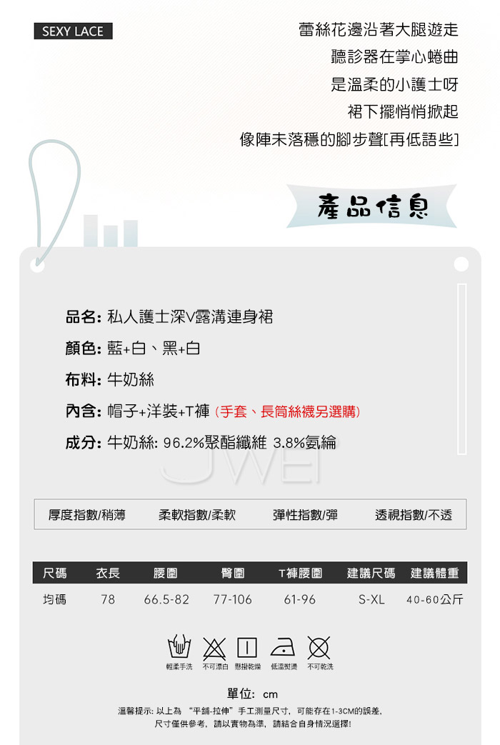 ■內容物:帽子+洋裝+T褲 ■適穿尺寸:FREESIZE ■彈性:彈 ■未撐開平量尺寸正負誤差1~2cm,1吋=2.54cm ■注意事項:基於保障消費者個人衛生,此貼身衣物恕不接受退換貨。 (如為商品本身暇疵,接受七日內換貨,請勿試穿,謝謝您)