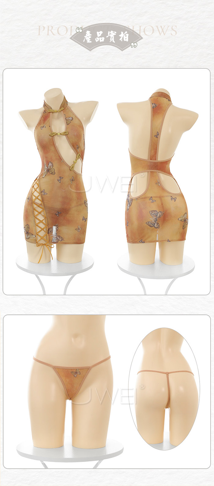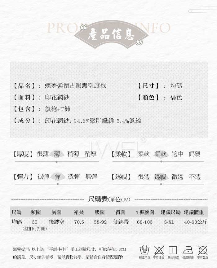 ■內容物:旗袍+T褲 ■適穿尺寸:FREESIZE ■彈性:彈 ■未撐開平量尺寸正負誤差1~2cm,1吋=2.54cm ■注意事項:基於保障消費者個人衛生,此貼身衣物恕不接受退換貨。 (如為商品本身暇疵,接受七日內換貨,請勿試穿,謝謝您)