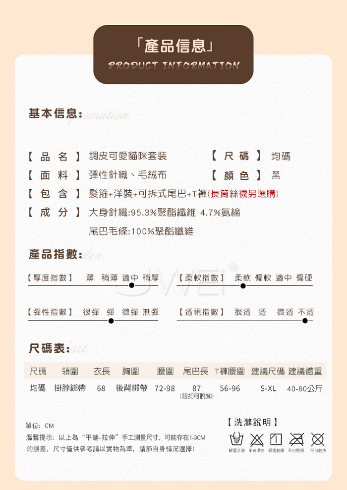 ■內容物:髮箍+洋裝+可拆式尾巴+T褲 ■適穿尺寸:FREESIZE ■彈性:彈 ■未撐開平量尺寸正負誤差1~2cm,1吋=2.54cm ■注意事項:基於保障消費者個人衛生,此貼身衣物恕不接受退換貨。 (如為商品本身暇疵,接受七日內換貨,請勿試穿,謝謝您)