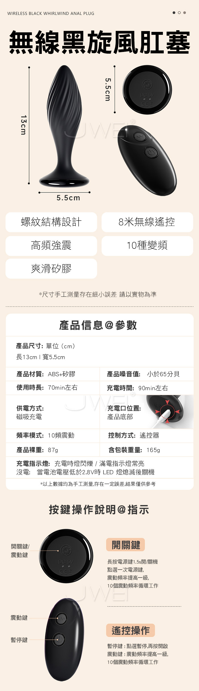 探索後庭 陰肛兩用,無線·黑旋風肛塞“智能肛塞” 8米遙控快樂不斷檔,無線遙控,外出調情利器 10種變頻強震酥麻刺激加倍,快慢隨心 螺紋結構設計,激爽摩擦 精準高潮 ■尺寸:大小詳如圖片標示 ■材質:矽膠+ABS ■功能:10頻震動+遙控