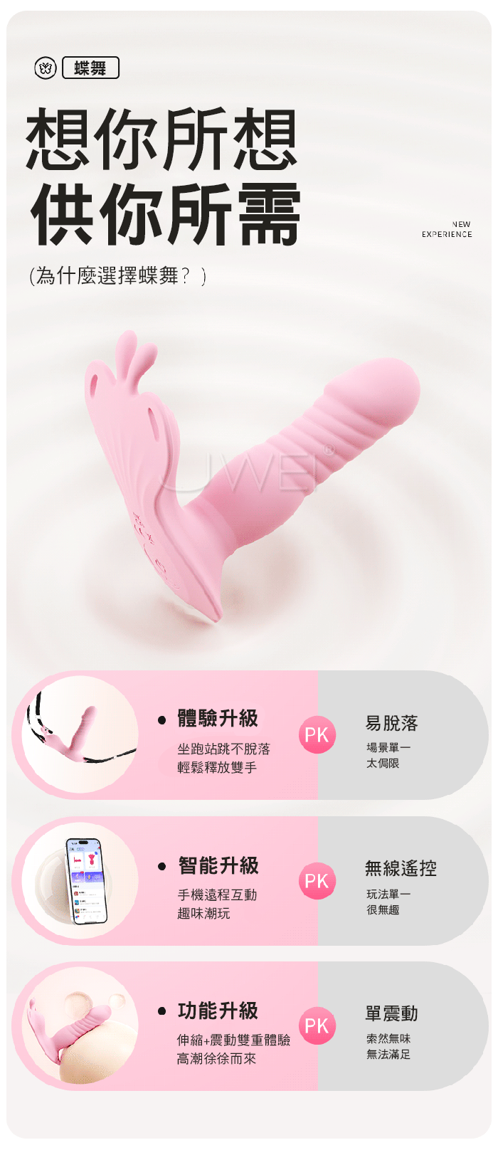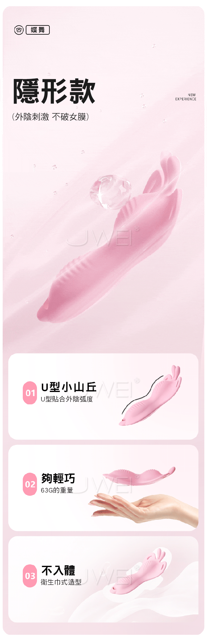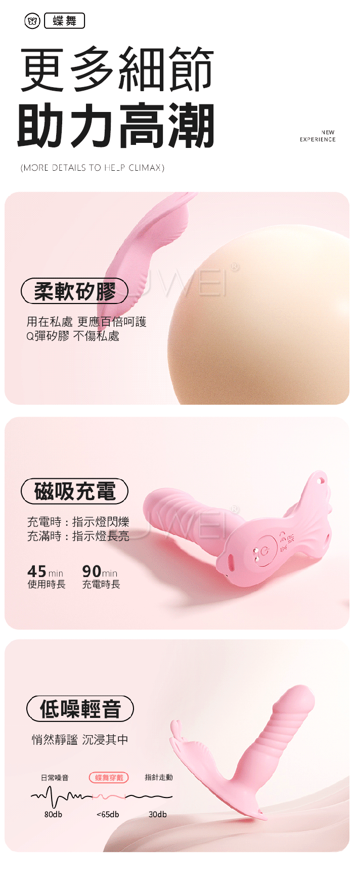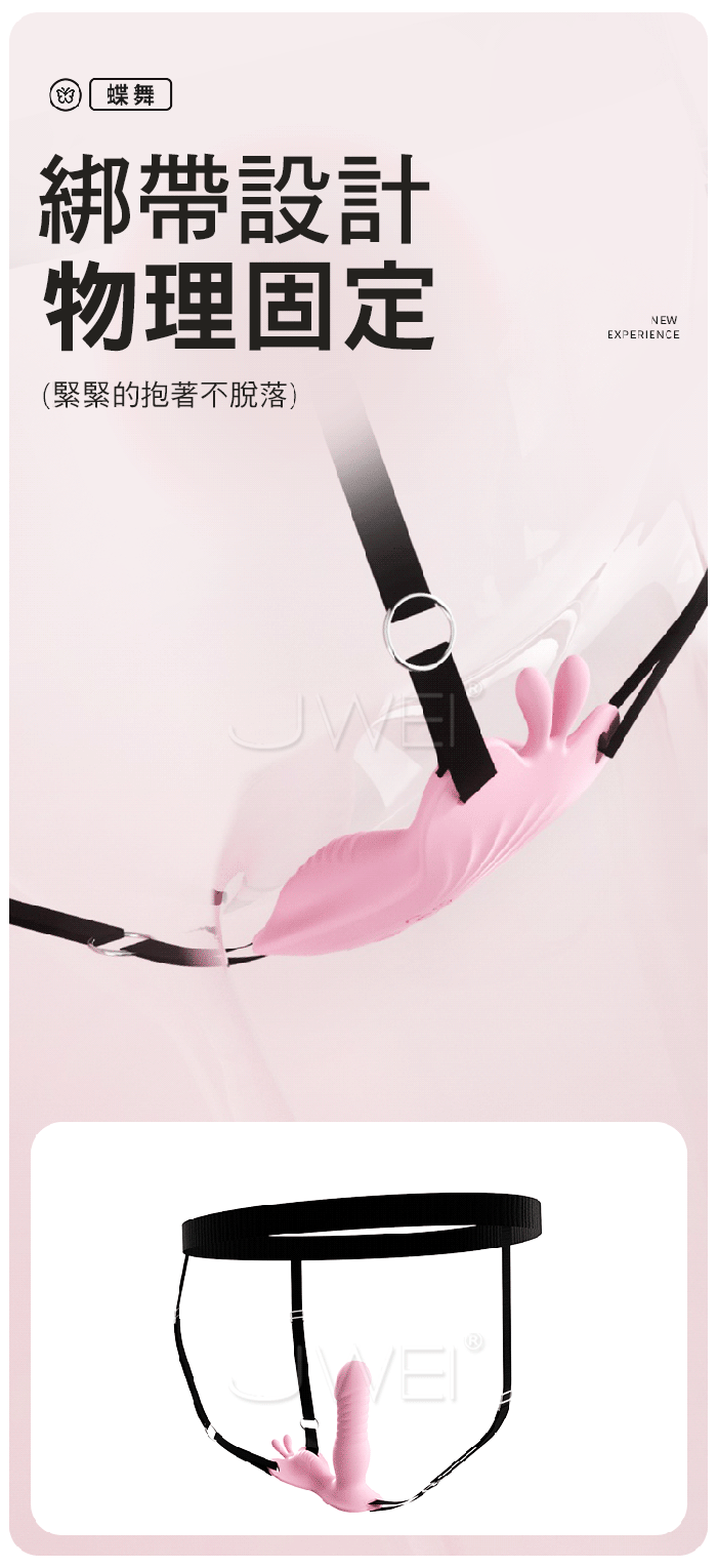 如蝶舞般,貼合肌膚,開啟私密愉悅新體驗 綁帶設計,物理固定,緊緊的抱著不脫落,集中刺激!! 手机遥控智能APP,創意玩法不重樣 體驗不一樣的快樂 3種強度6種變頻,高頻震動,萬轉高速機芯併發超強能量 ■尺寸:大小詳如圖片標示 ■材質:矽膠+ABS ■供電:USB充電 ■模式:9頻強震、APP智控