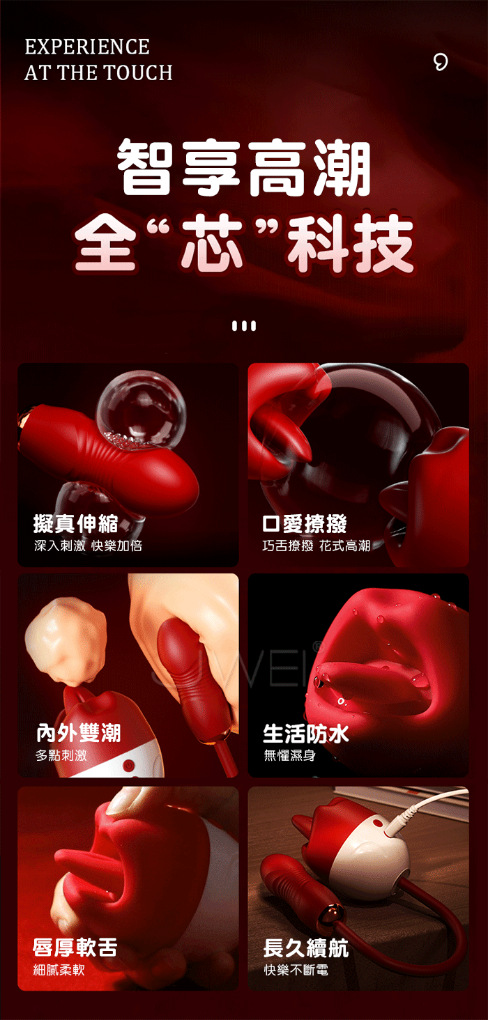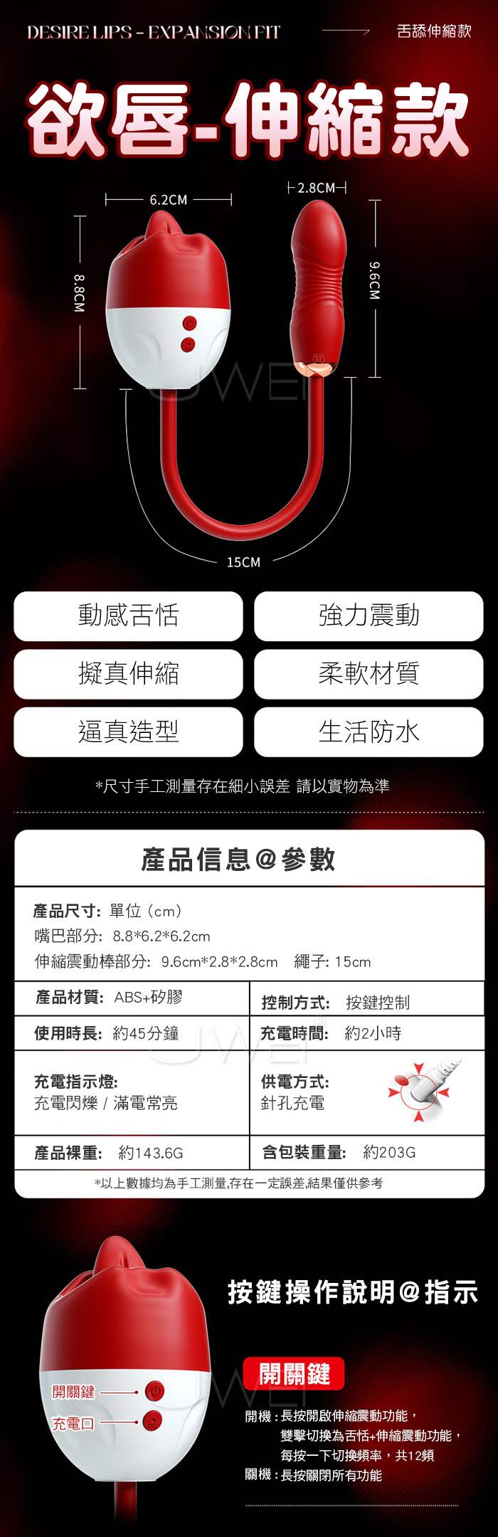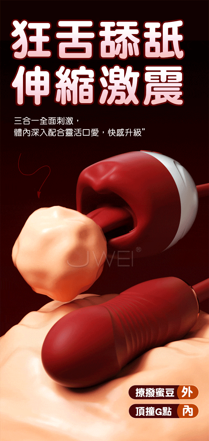 狂舌舔舐伸縮激震,全面刺激,體內深入配合靈活口愛,快感升級 強勁舌撩,動感搖擺,輪番刺激快樂到失控 仿真衝擊不撐大私處,爽滑入體如男友一樣挺進 動感強震,縱享急速高潮,多點觸碰全面綻放 ■尺寸:大小詳如圖片標示 ■材質:TPE+ABS ■供電:針孔充電 ■功能:12頻伸縮+舌舔+震動