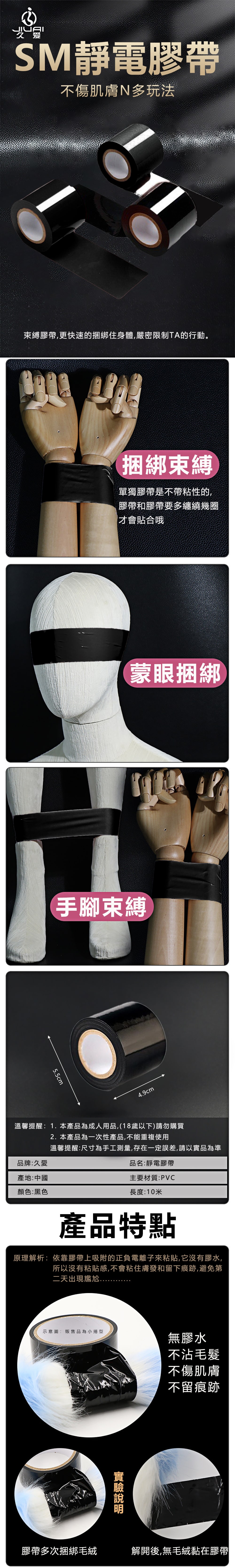 用途:男女情趣之用 材質:聚氯乙烯 規格:安全設計/10米/黑色 淨重:約64g 總重:約64g 尺寸:面寬約4.8cm 外盒尺寸:5.3x5.3x4.9cm 產地:中國 注意:請與潤滑液共用.並保存於陰涼處,欲重覆使用.用後清水沖洗。 ※情趣用品屬於個人衛生用品,經拆封使用,無法接受退換貨!※ ※每台電腦的解析度皆不同,可能有些微色差,顏色皆以實品為主!※