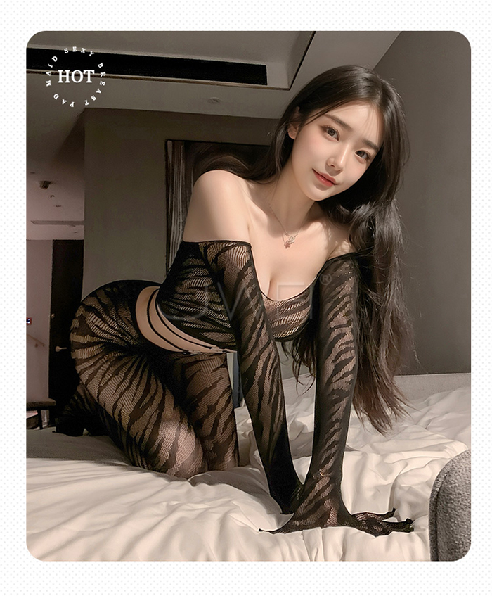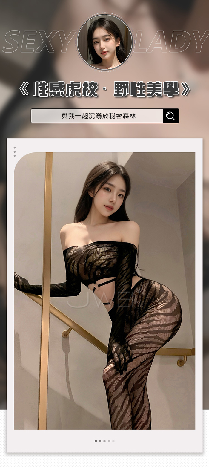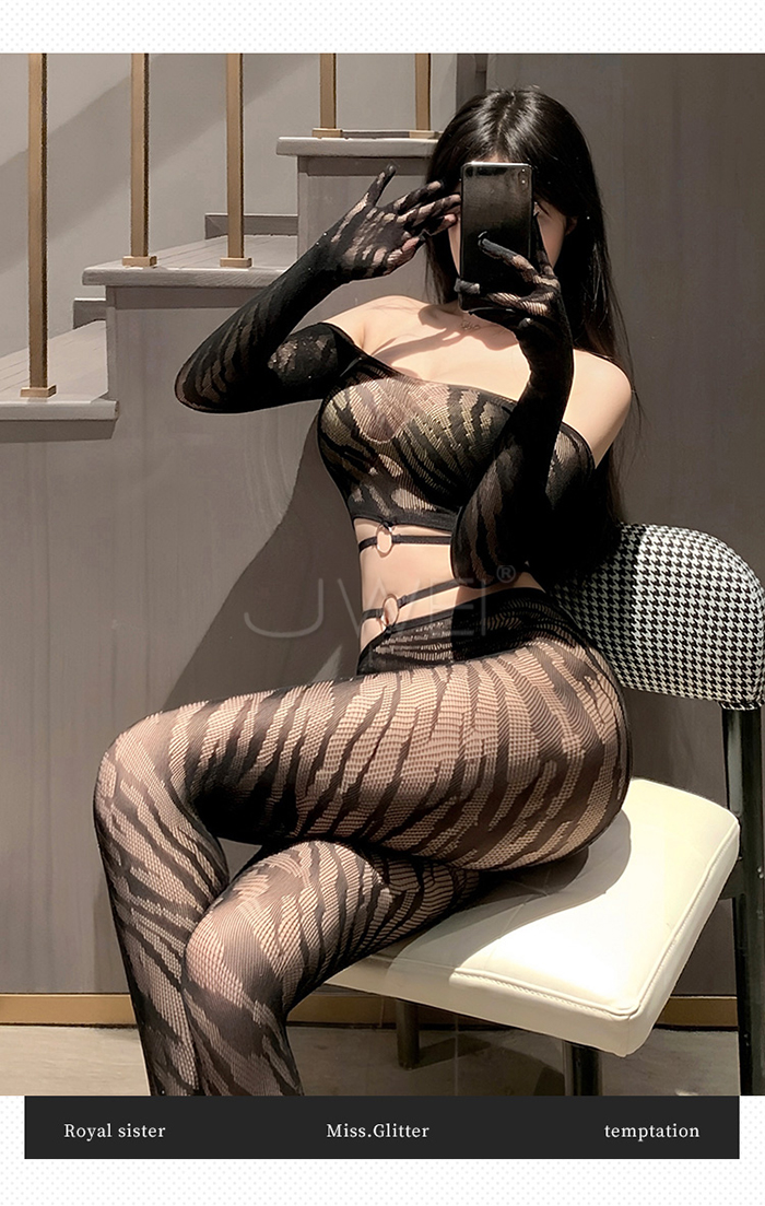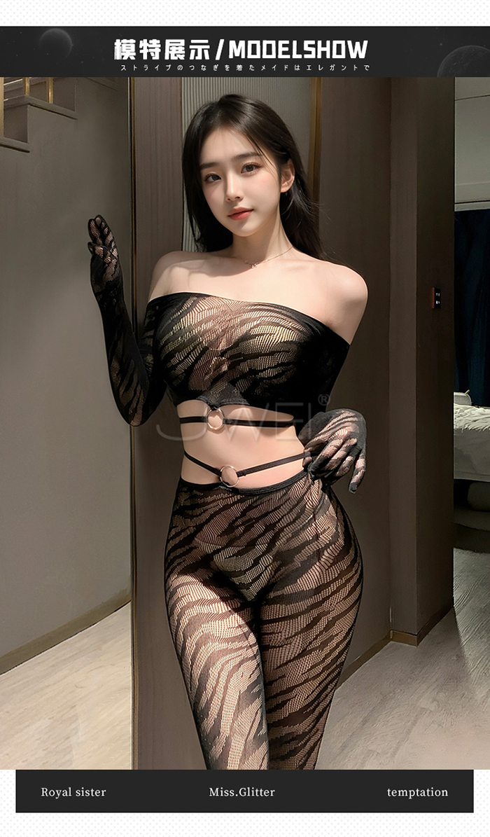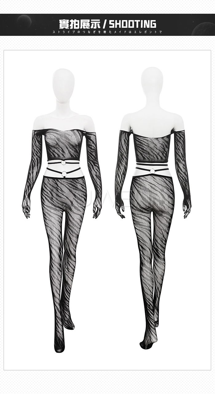 ►您現在的位置:首頁>野性美學.性感虎紋一字肩環飾透胸分體式露腰網襪套裝【一字肩網衣+連褲襪】