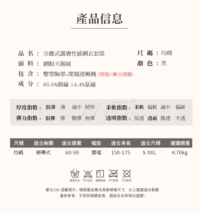 ■內容物:繋帶胸罩+開襠連褲襪 ■適穿尺寸:FREESIZE ■彈性:彈 ■未撐開平量尺寸正負誤差1~2cm,1吋=2.54cm ■注意事項:基於保障消費者個人衛生,此貼身衣物恕不接受退換貨。 (如為商品本身暇疵,接受七日內換貨,請勿試穿,謝謝您)