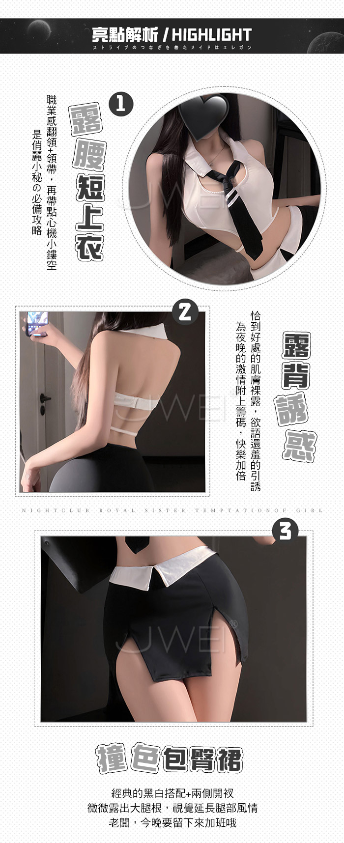 | OL領域.挖空露腰美背撞色雙開衩包臀裙OL小秘制服套裝【上衣+領帶+包臀裙+內褲】