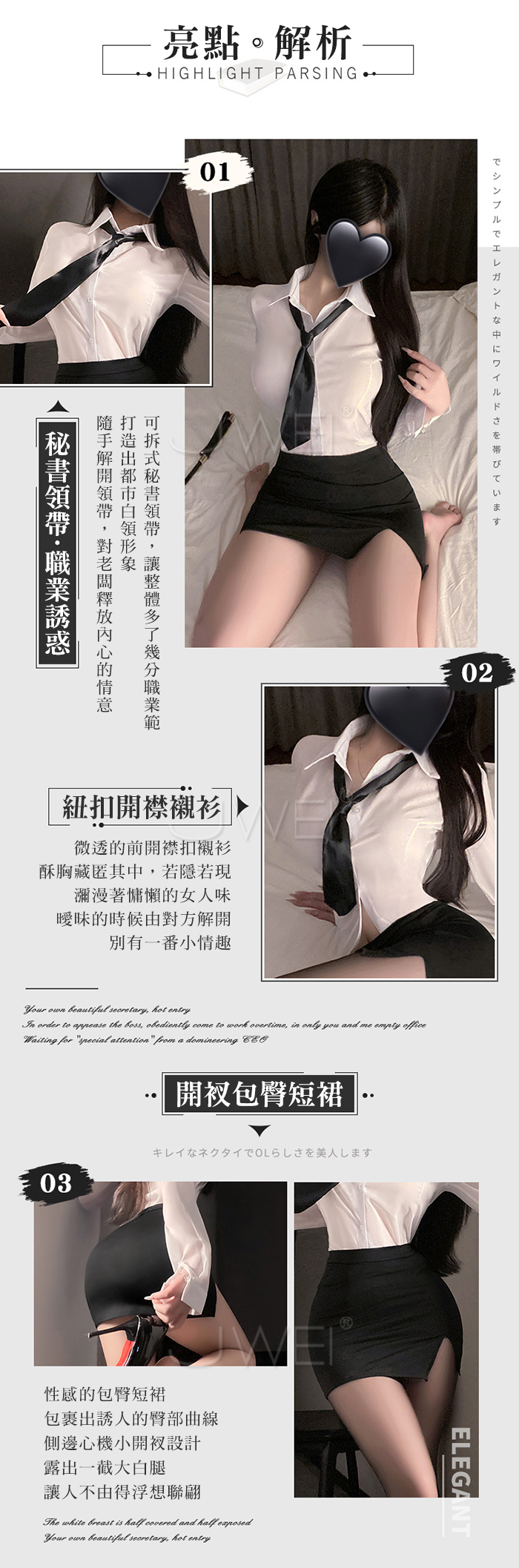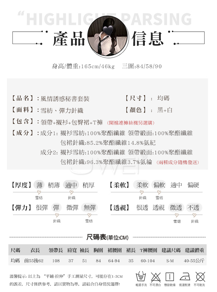 ■內容物:領帶+襯衫+包臀裙+T褲 ■適穿尺寸:FREESIZE ■彈性:彈 ■未撐開平量尺寸正負誤差1~2cm,1吋=2.54cm ■注意事項:基於保障消費者個人衛生,此貼身衣物恕不接受退換貨。 (如為商品本身暇疵,接受七日內換貨,請勿試穿,謝謝您)