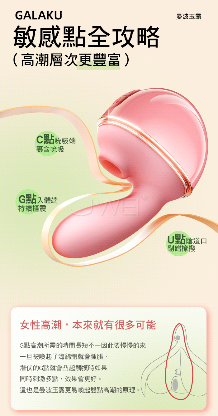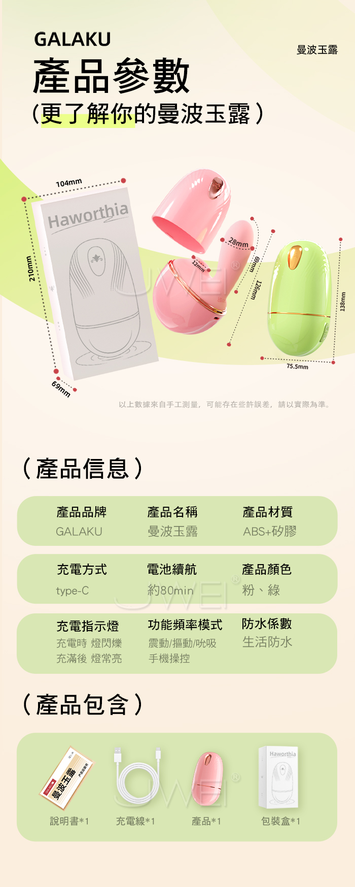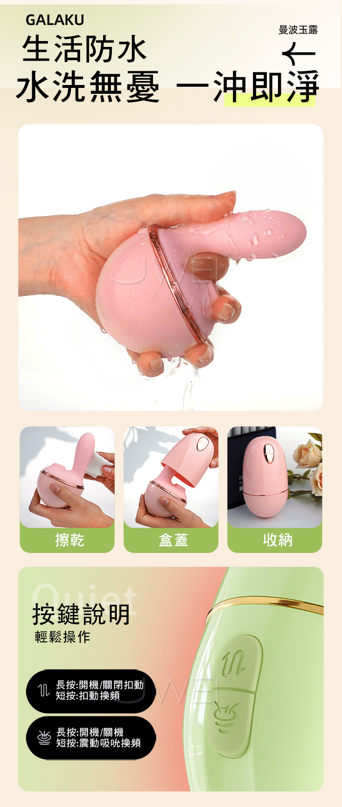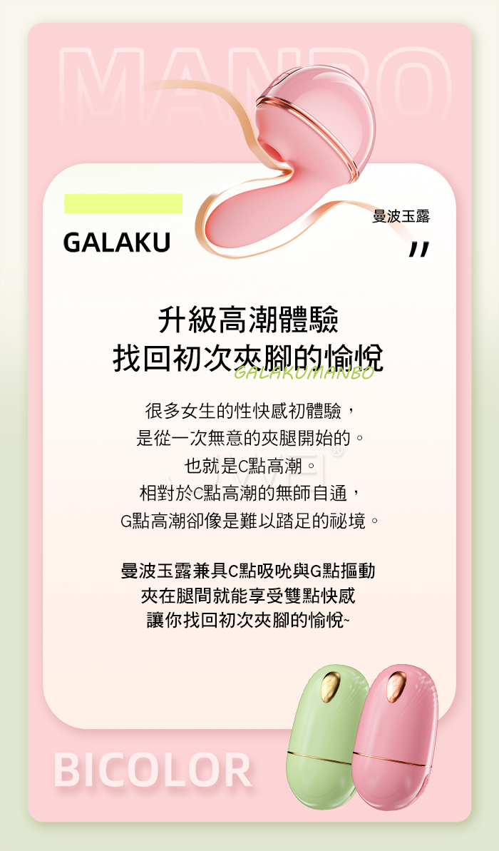 雙潮喚起,夾住腿就能嗨,曼波玉露兼具C點吸吮與G點摳動 夾在腿間就能享受雙點快感,讓你找回初次夾腳的愉悅~ 靈指摳動強震,精準揉按G點,車好馬快不如方向對 產品規格 ■材質: 矽膠+ABS ■規格: 詳如圖片標示 ■功能: 10頻摳動、10頻吮吸、APP智控