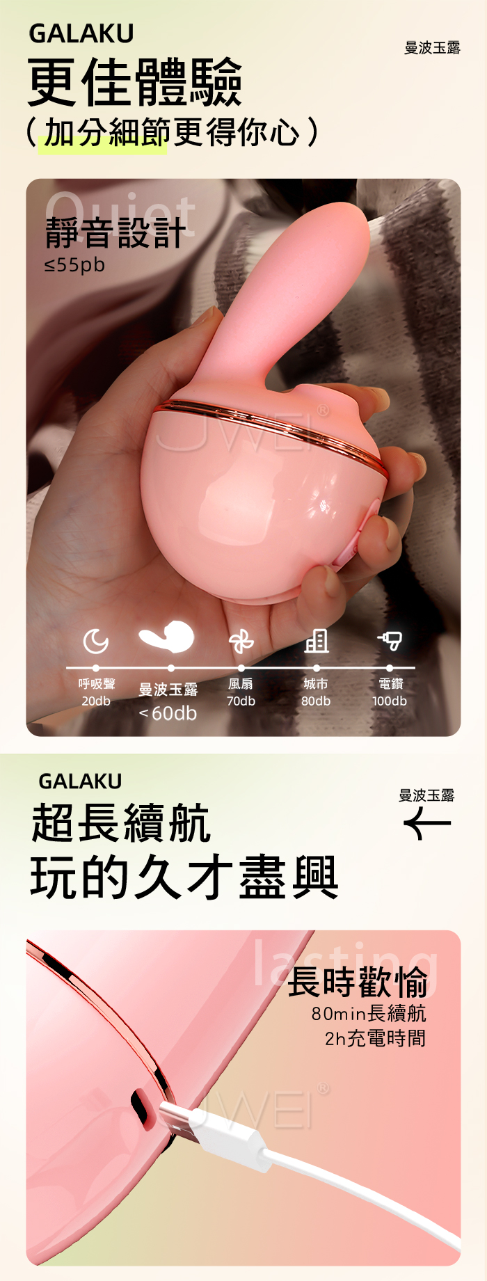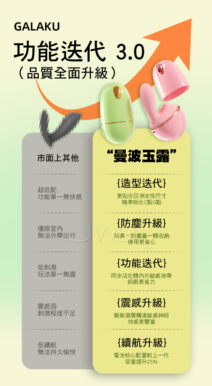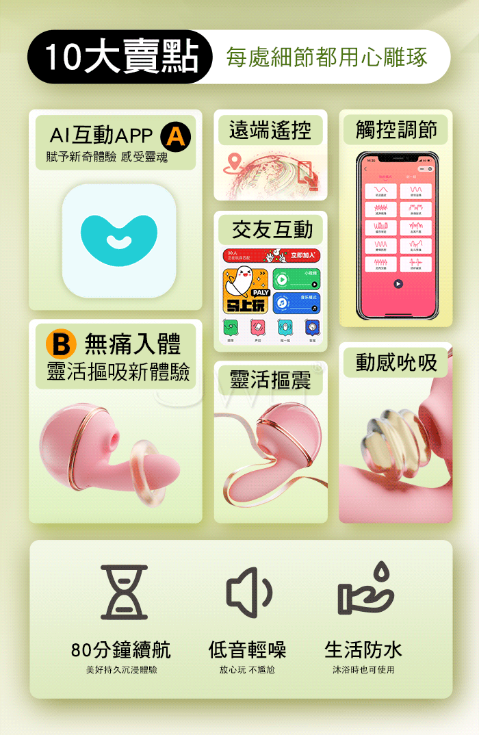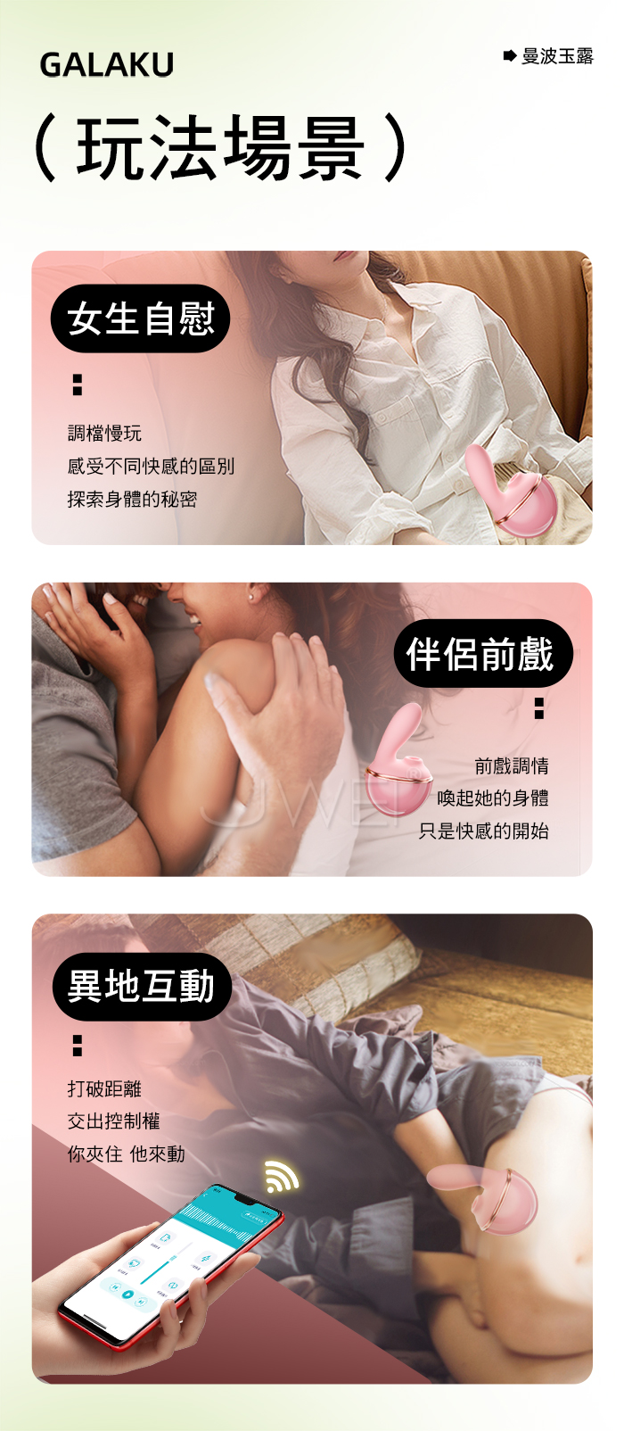 雙潮喚起,夾住腿就能嗨,曼波玉露兼具C點吸吮與G點摳動 夾在腿間就能享受雙點快感,讓你找回初次夾腳的愉悅~ 靈指摳動強震,精準揉按G點,車好馬快不如方向對 產品規格 ■材質: 矽膠+ABS ■規格: 詳如圖片標示 ■功能: 10頻摳動、10頻吮吸、APP智控