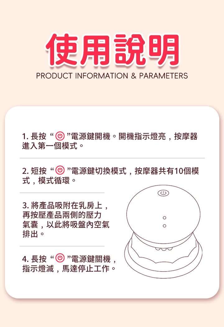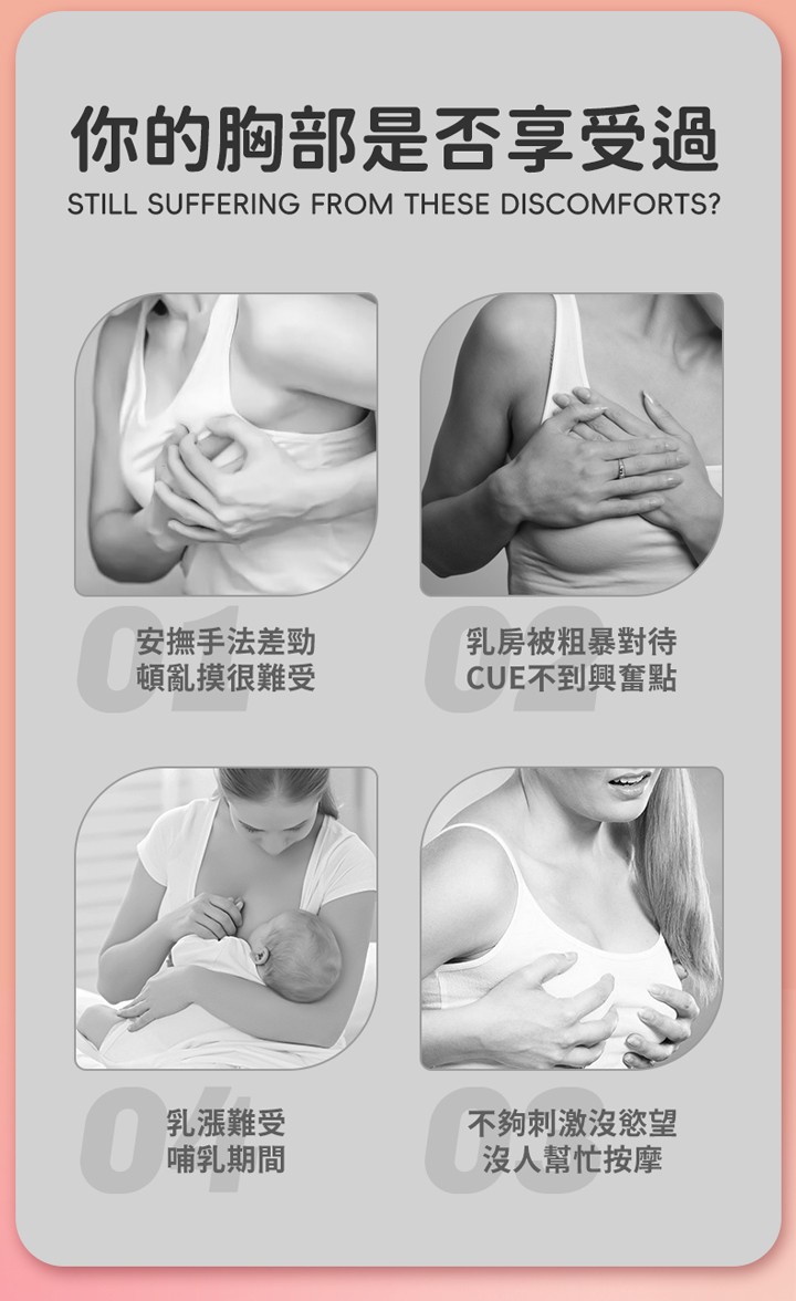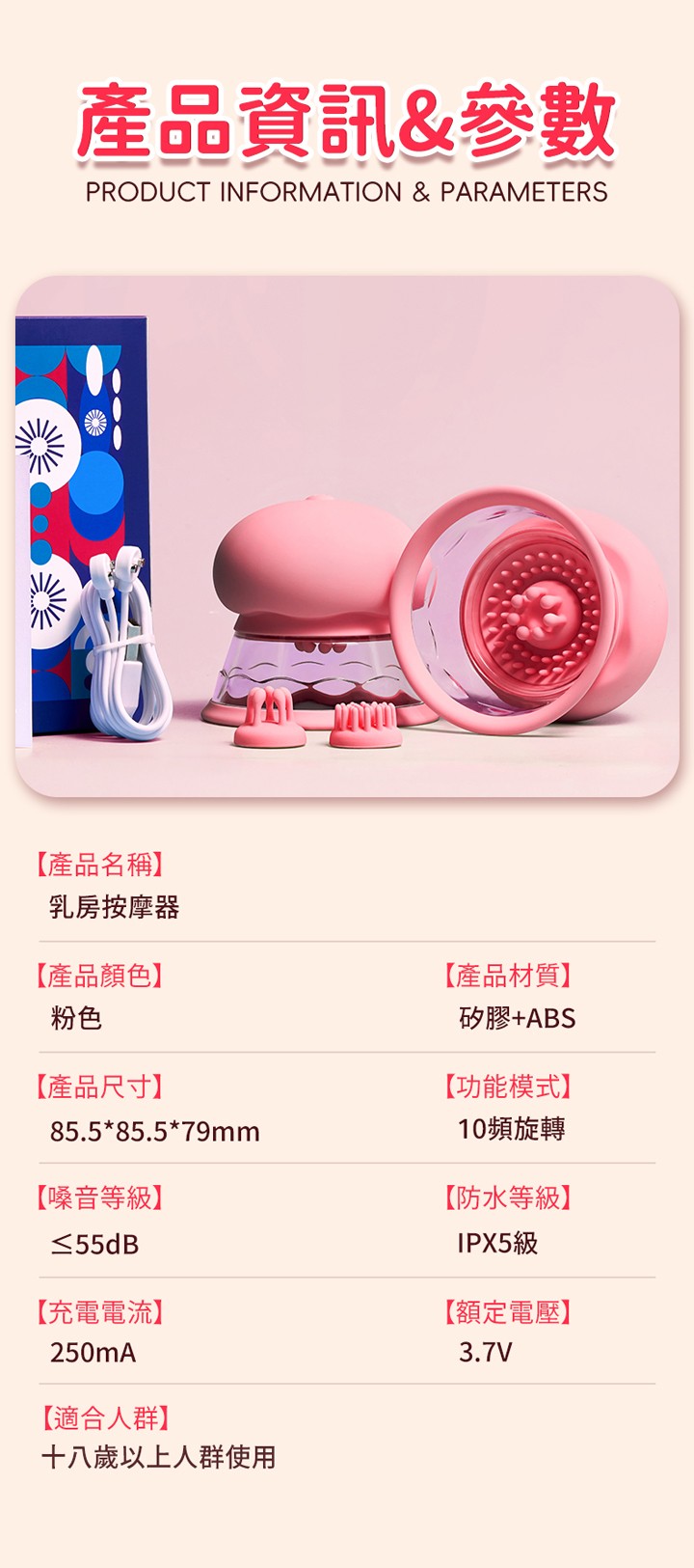 產品內容:乳房按摩器一對+專用配件3種、原廠充電線、產品盒