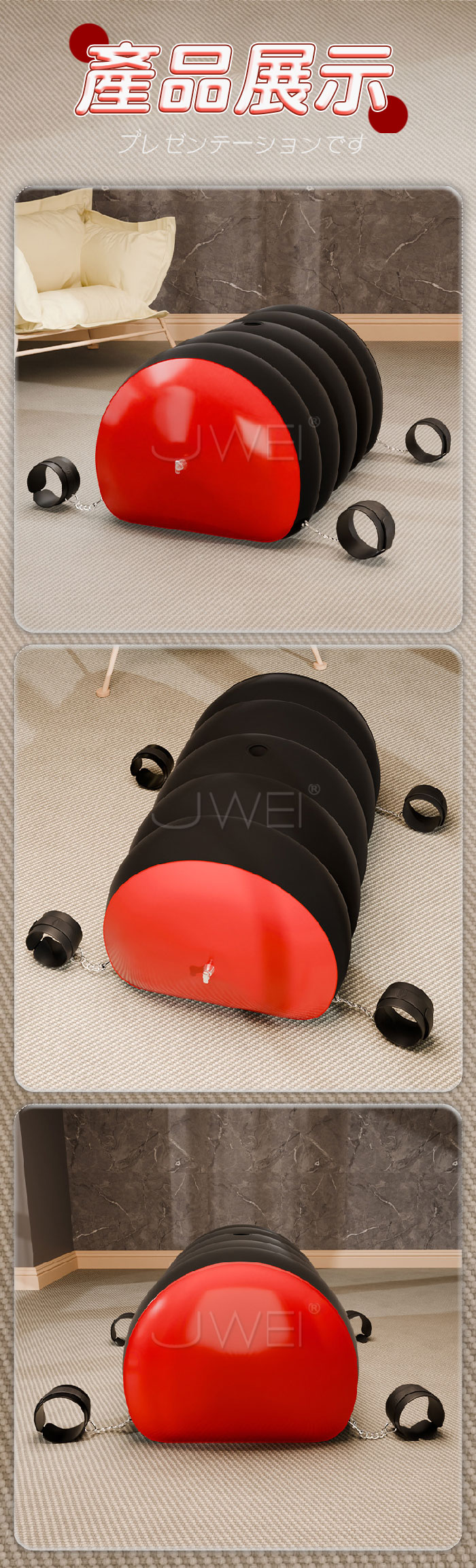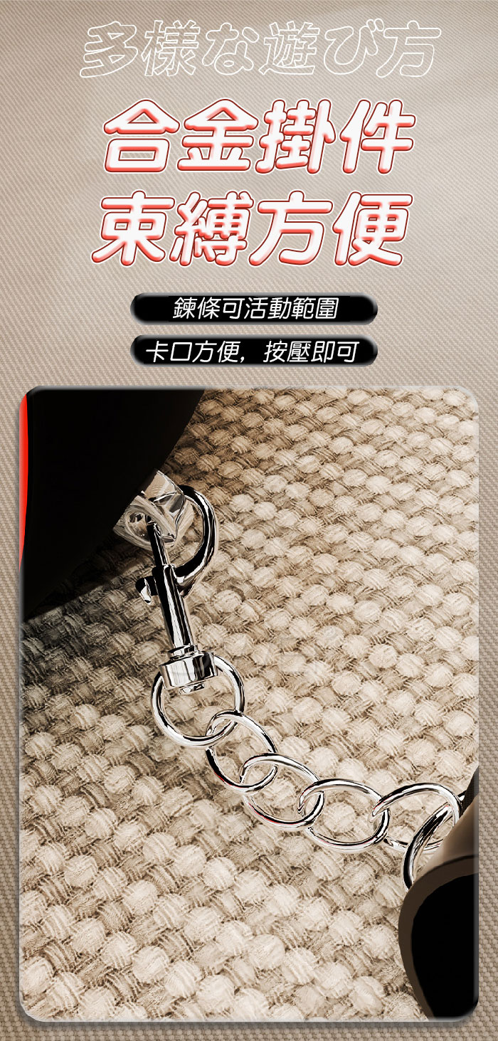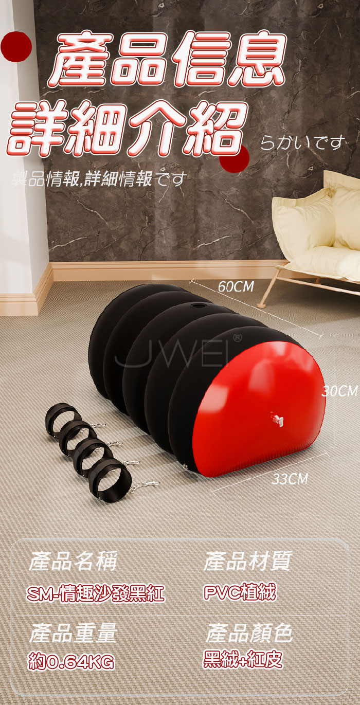 高彈枕身 柔軟支撐 束縛手腳 讓愛更有趣! 讓每一刻都充滿浪漫 搭配小道具 開啟新體驗! ■尺寸:大小詳如圖片標示 ■材質:PVC植絨 ■注意: SM道具請以安全、清醒、非強迫為使用原則, 使用前請先徵得對方的同意