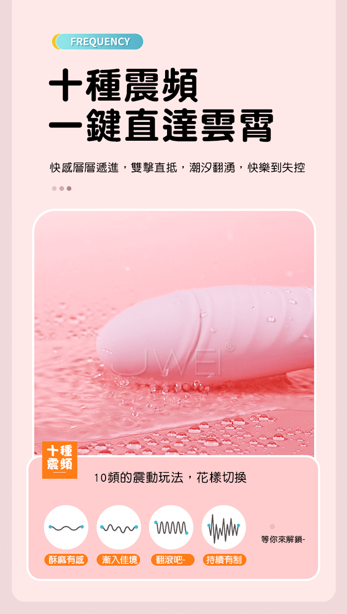 十種震頻,一鍵直達雲霄,快感層層遞進,雙擊直抵,潮汐翻湧,快樂到失控