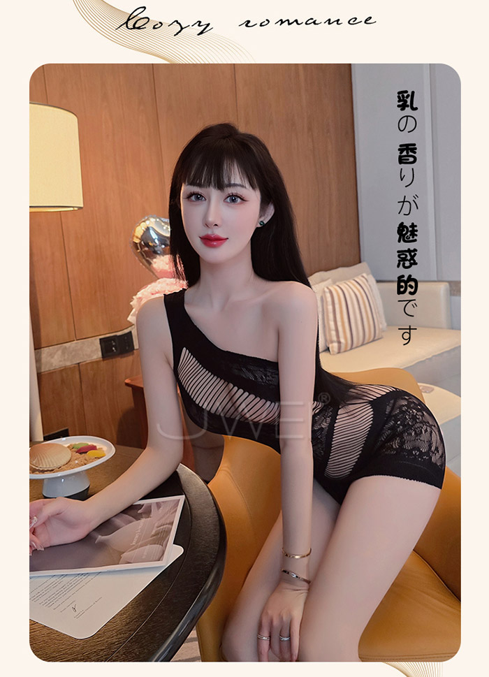 | 魅惑乳香.斜肩鏤空露乳半遮蜜桃包臀網衣-黑色【單件網衣+黑色網眼手套】