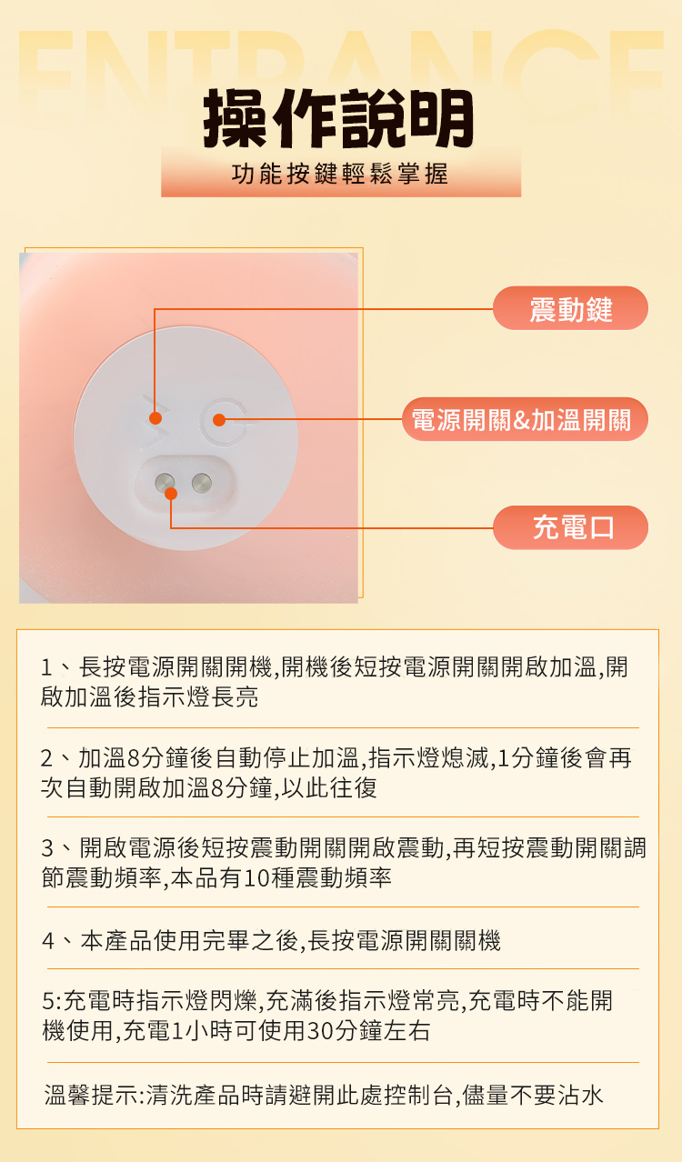 工作狀態:長亮加溫狀態:閃爍是否支援快充:不支援防水等級:生活防水供電方式:磁吸充電口電壓:≤3.7V電池容量:1200mA充電時長:約1 H使用時長:約30分鐘
