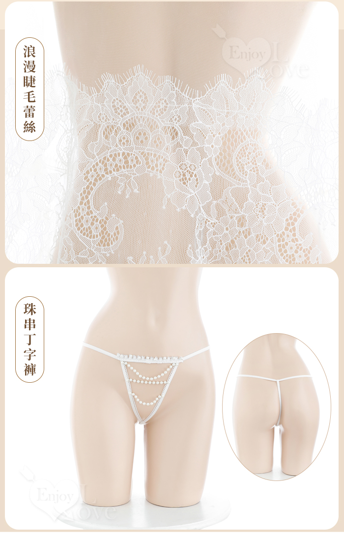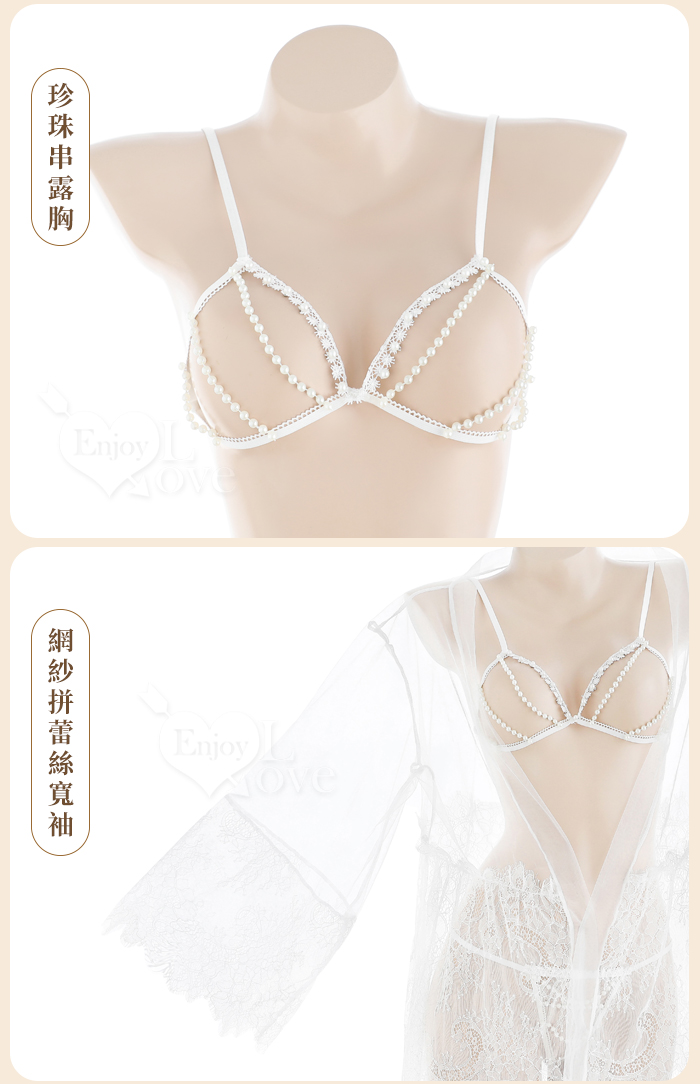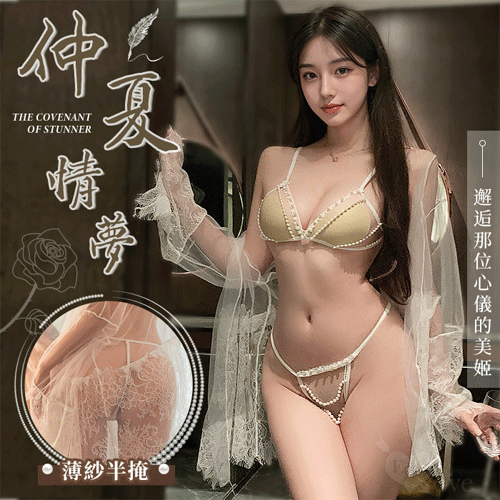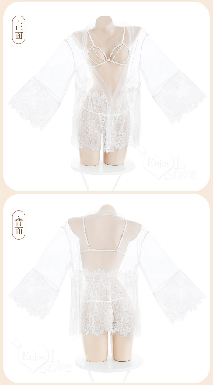 | 鏤空珠串蕾絲情趣套裝|透紗罩衫+珠鏈比基尼+丁字褲三件組