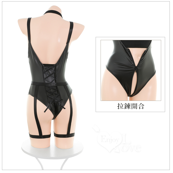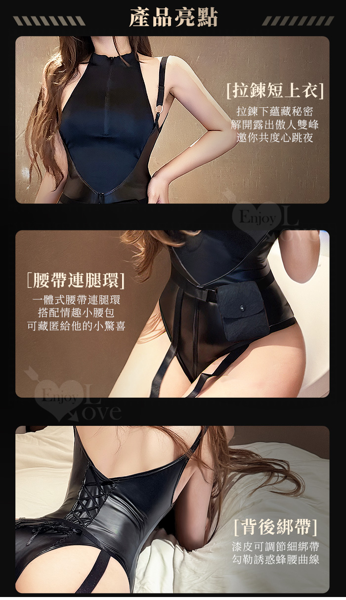 | 酷感削肩漆皮連身衣|拉鍊開合設計+可拆腰帶腿環四件式套裝