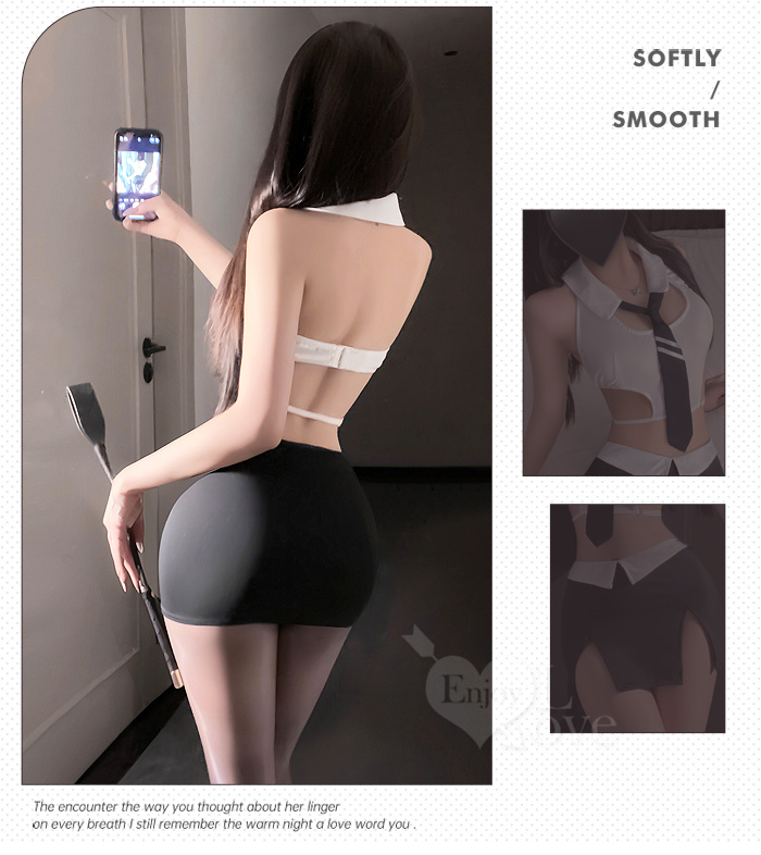 秘書角色扮演服!細帶露腰短上衣撞色雙開衩包臀裙四件式套裝