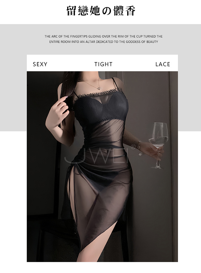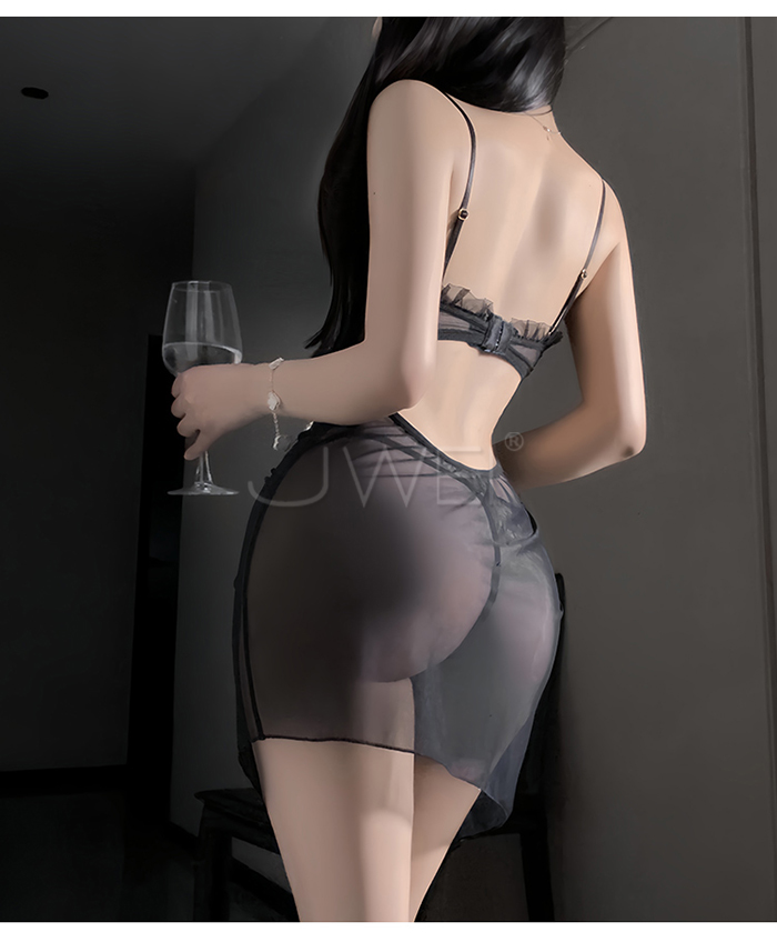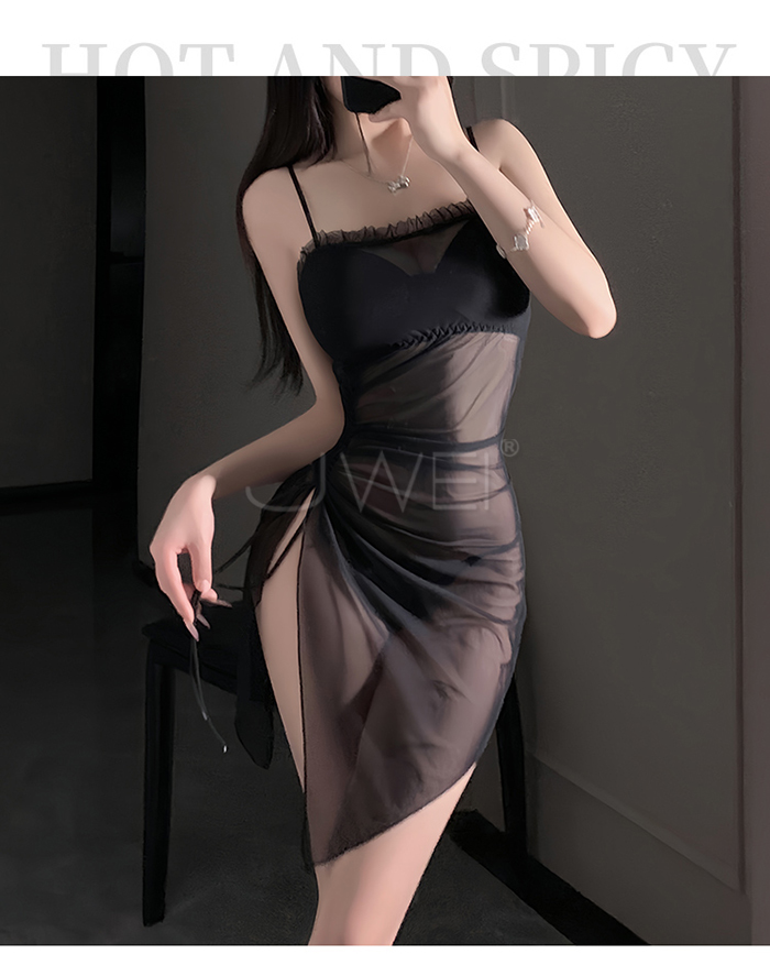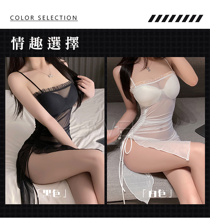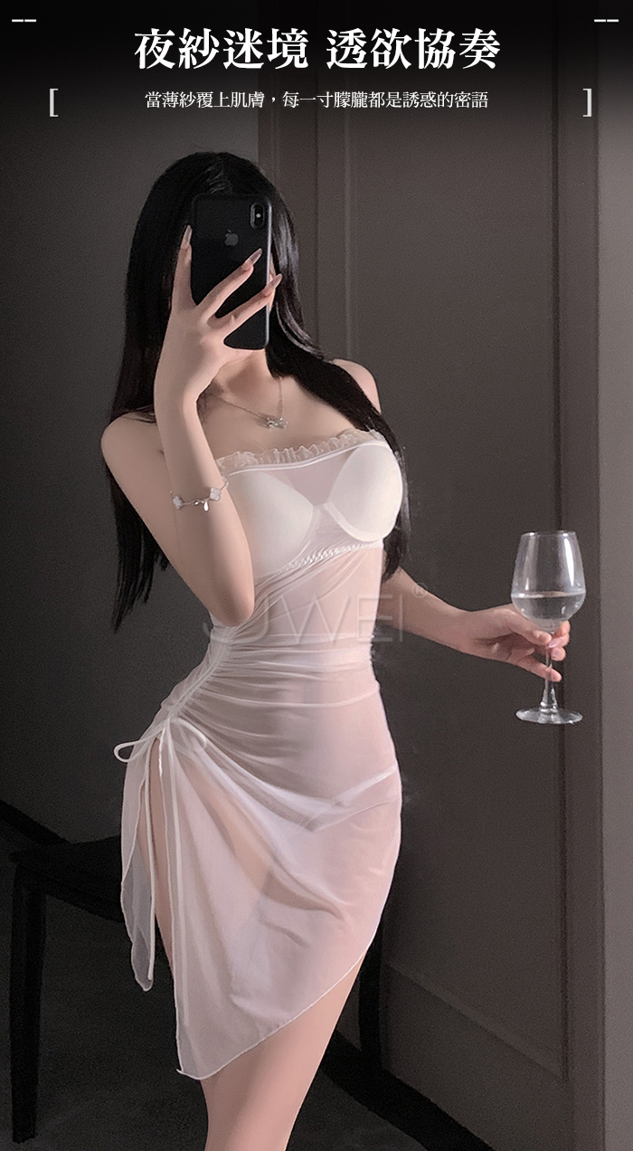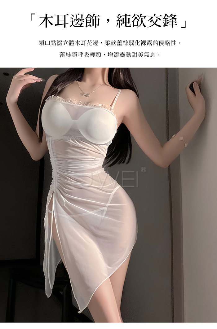 首頁>夜紗迷境.韻味透紗木耳邊飾側開衩抽褶收腰睡裙【睡裙+T褲-白色】