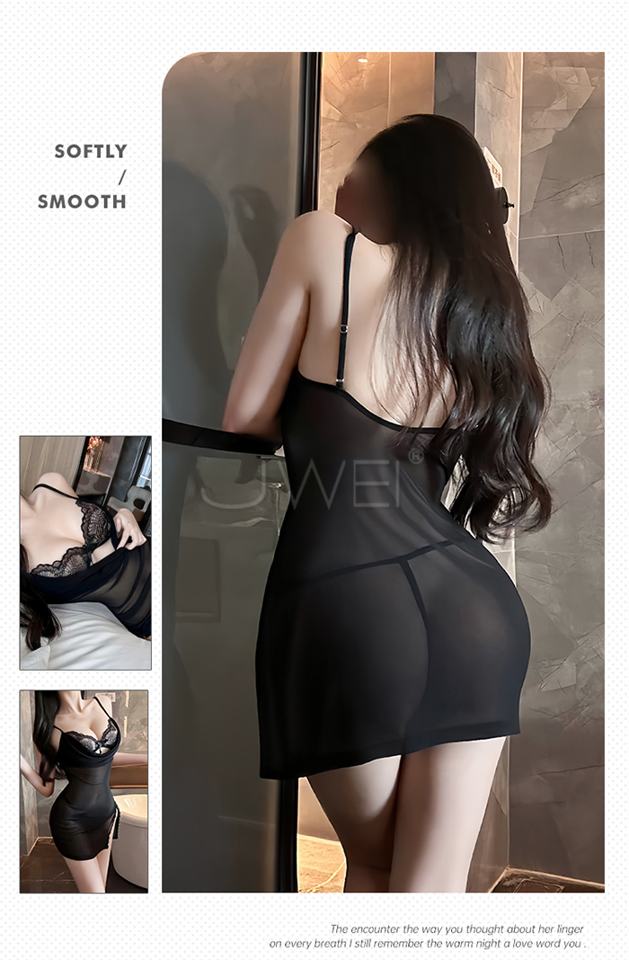 ►您現在的位置:首頁>月暮迷紗.性感裸紗蕩領透視側開衩細肩帶美背睡裙【睡裙+T褲-黑色】