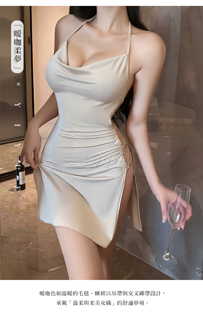 | 綺夢暗香.優雅蕩領美背綴腰掛脖後繫帶睡裙【奶咖色】