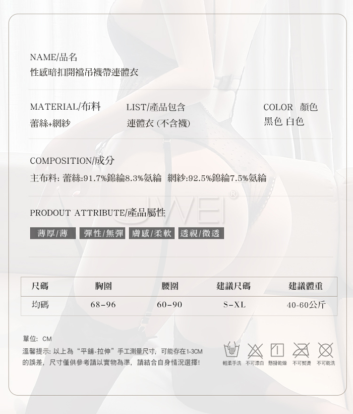 ■內容物:單件連體吊襪帶 ■適穿尺寸:FREESIZE ■彈性:無彈 ■未撐開平量尺寸正負誤差1~2cm,1吋=2.54cm ■注意事項:基於保障消費者個人衛生,此貼身衣物恕不接受退換貨。 (如為商品本身暇疵,接受七日內換貨,請勿試穿,謝謝您)