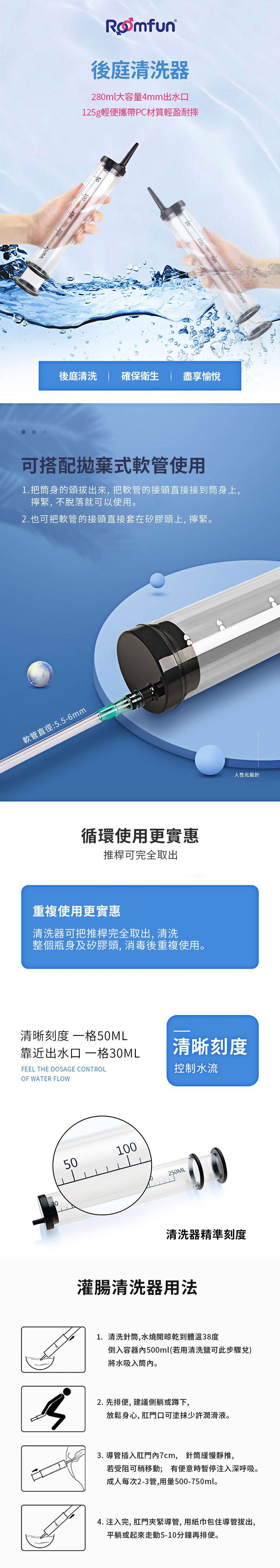 用途:男女情趣之用 材質:熱塑性彈性體+樹脂 規格:安全設計 淨重:約125g 總重:約180g 尺寸:長26.4x寬5x深5cm,噴嘴頭長約5cm 外盒尺寸:27x6x5.5cm 產地:中國 內容物:水箱管x1、噴水頭x3 注意:請與潤滑液共用.並保存於陰涼處,欲重覆使用.用後清水沖洗。 ※情趣用品屬於個人衛生用品,經拆封使用,無法接受退換貨!※ ※每台電腦的解析度皆不同,可能有些微色差,顏色皆以實品為主!※