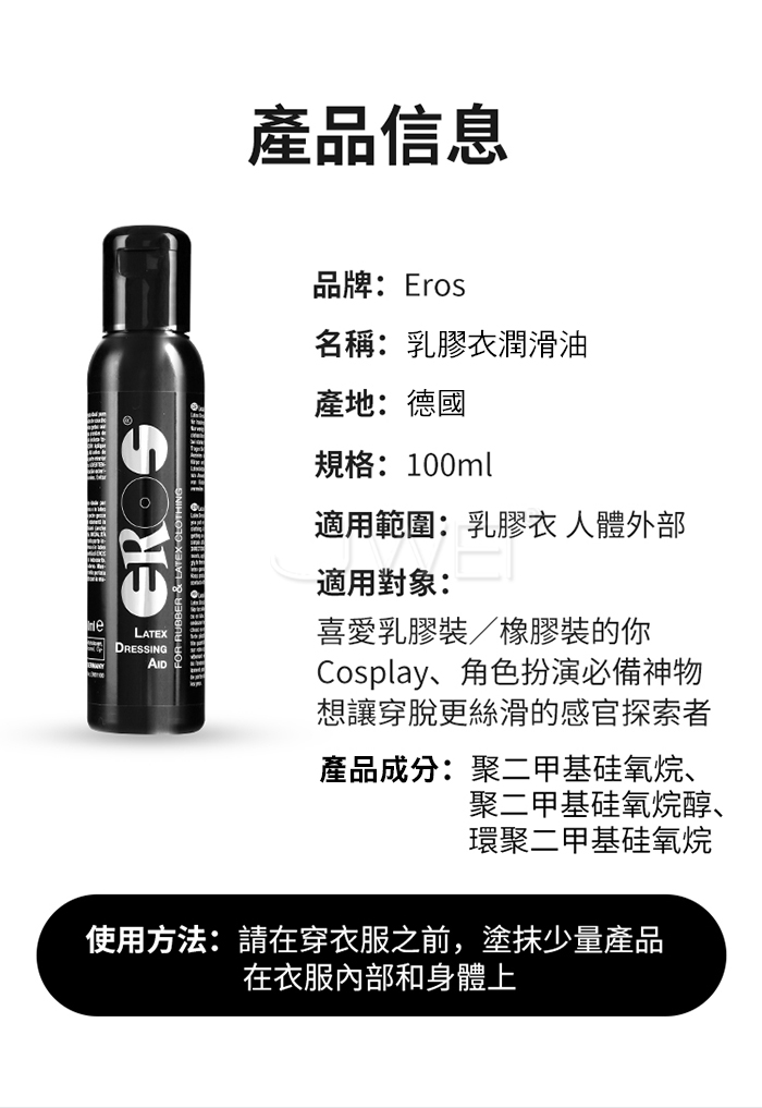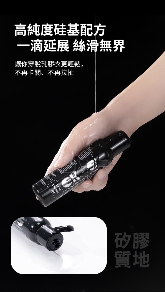 實驗驗證:即便是多毛的體膚也能毫無問題地穿戴進去。 穿乳膠裝卡卡的?讓這瓶潤滑液拯救你的每一次穿脫! 【產品特色】 ✔ 無水、無油、無香料,貼身更安心 ✔ 獨家潤滑配方,讓乳膠服緊貼不黏膩 ✔ 穿脫更輕鬆,不再卡關、不再拉扯 ✔ 減少摩擦,延長乳膠材質壽命 ✔ 德國原裝進口,品質穩定,專業首選 【使用方式】 1.噴灑於乾燥肌膚或乳膠衣內側 2.均勻塗抹後即可穿著 3.使用後可用濕布擦拭,無需沖洗 ■容量:100ml ■產地:德國