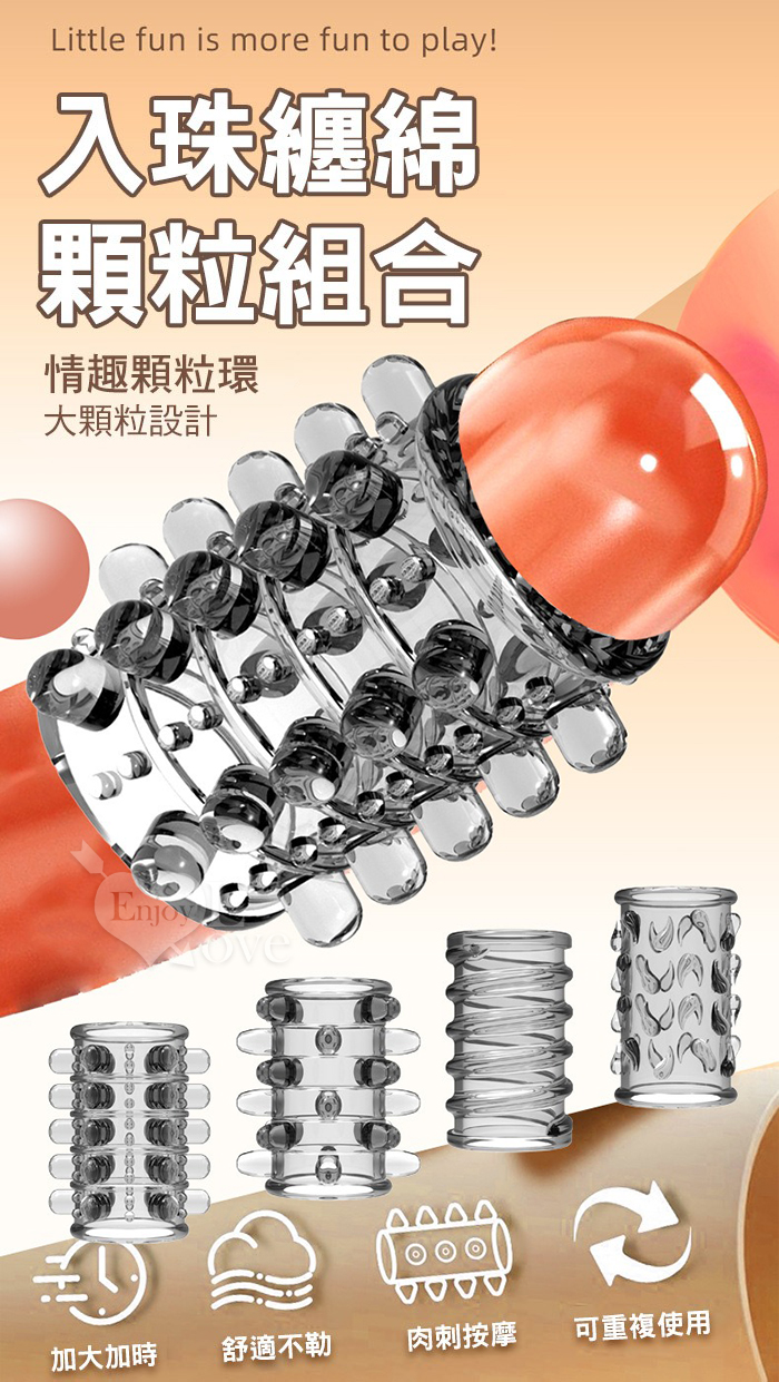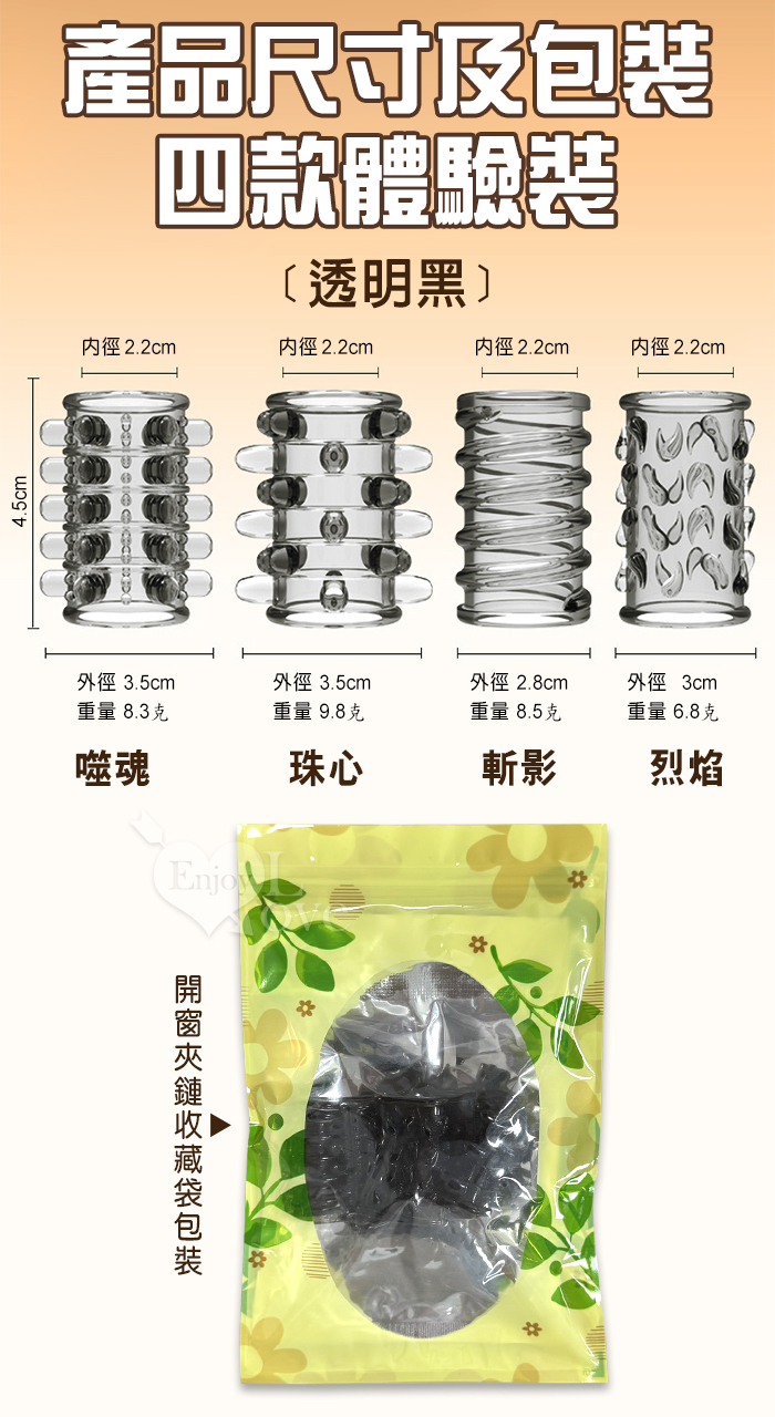 | 好戰4潮套.入珠纏綿顆粒組合~鎧甲延時鎖精陰莖加強環~成人性趣輔助用品-4款體驗裝﹝透明黑﹞