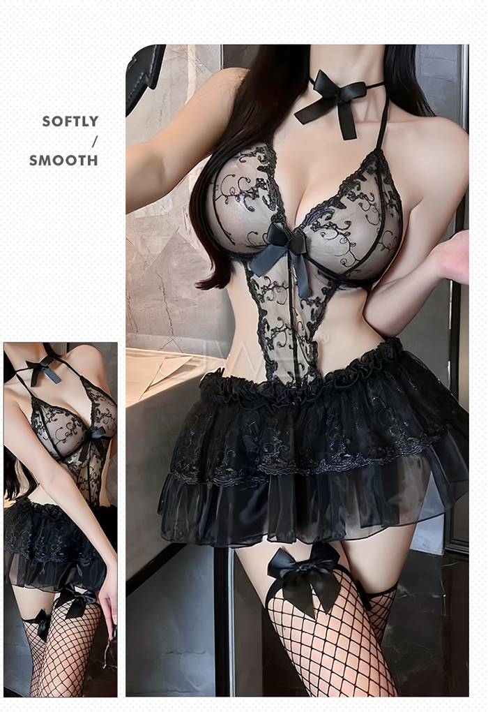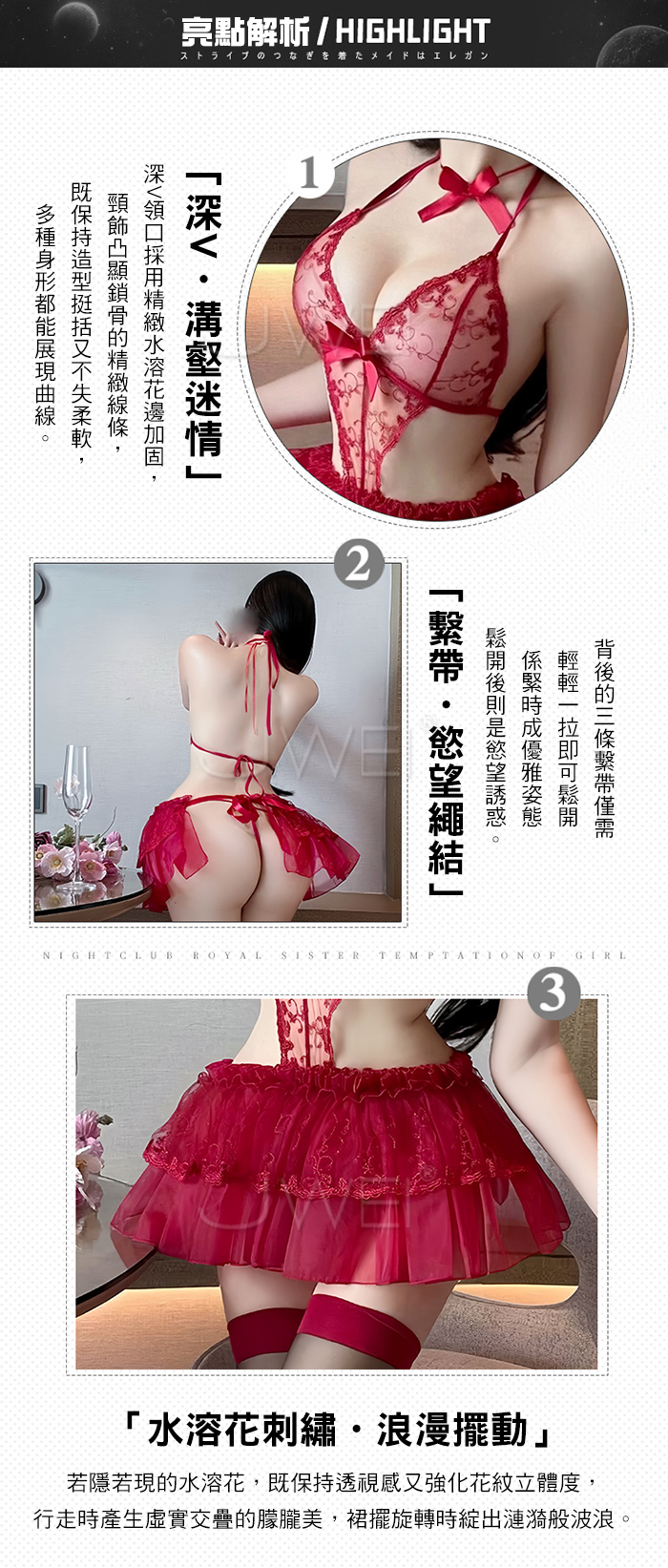 ►您現在的位置:首頁>暗夜派對.性感低胸透紗繩結繫帶水溶花刺繡裙擺派對裝【脖環+連身裙+T褲-酒紅】