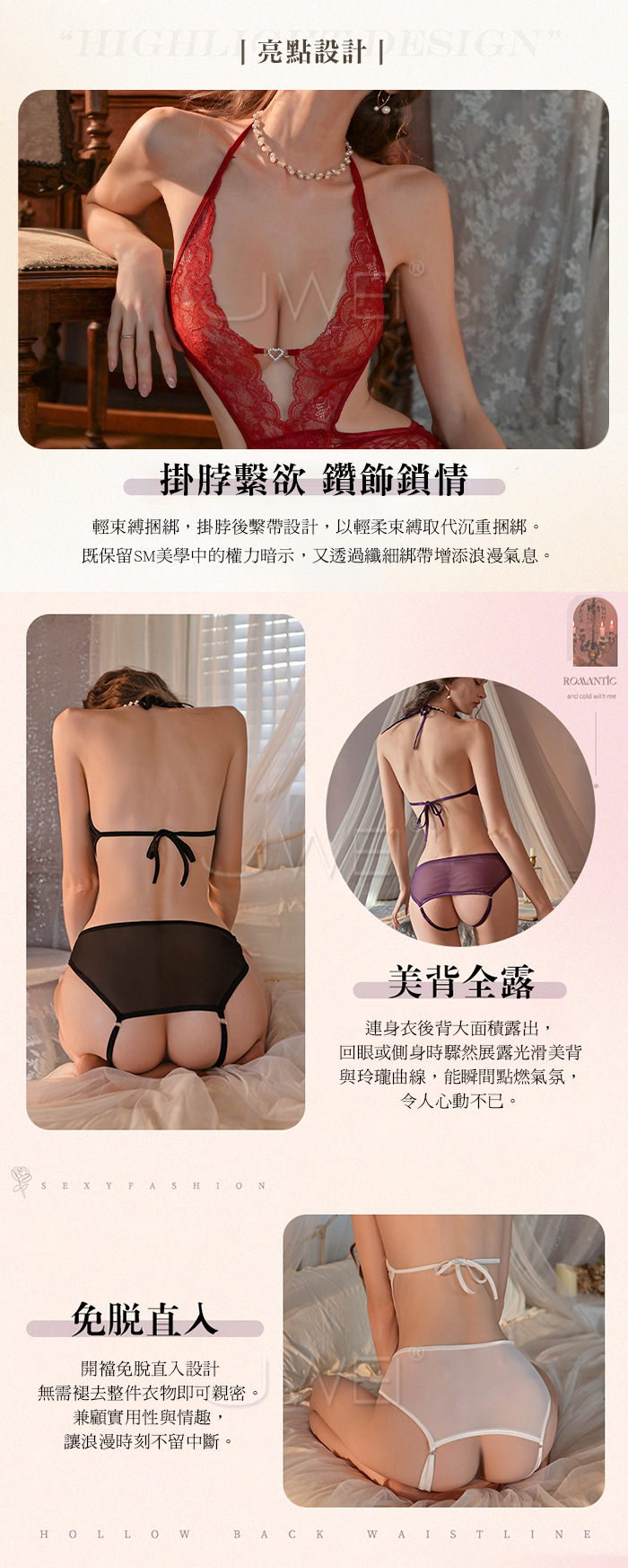 | 繁花似錦.深V愛心鑽飾露胸掛脖繫帶美背蕾絲開襠連體衣【紫色】