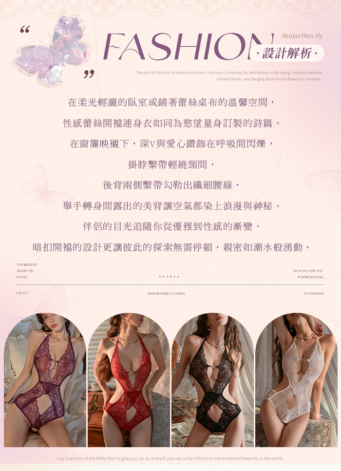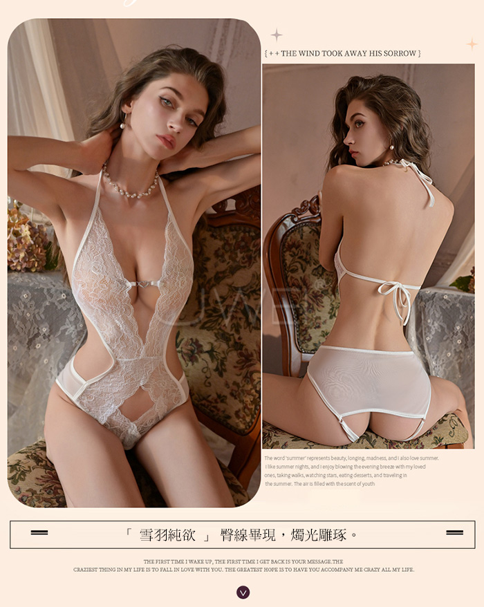首頁>繁花似錦.深V愛心鑽飾露胸掛脖繫帶美背蕾絲開襠連體衣【白色】