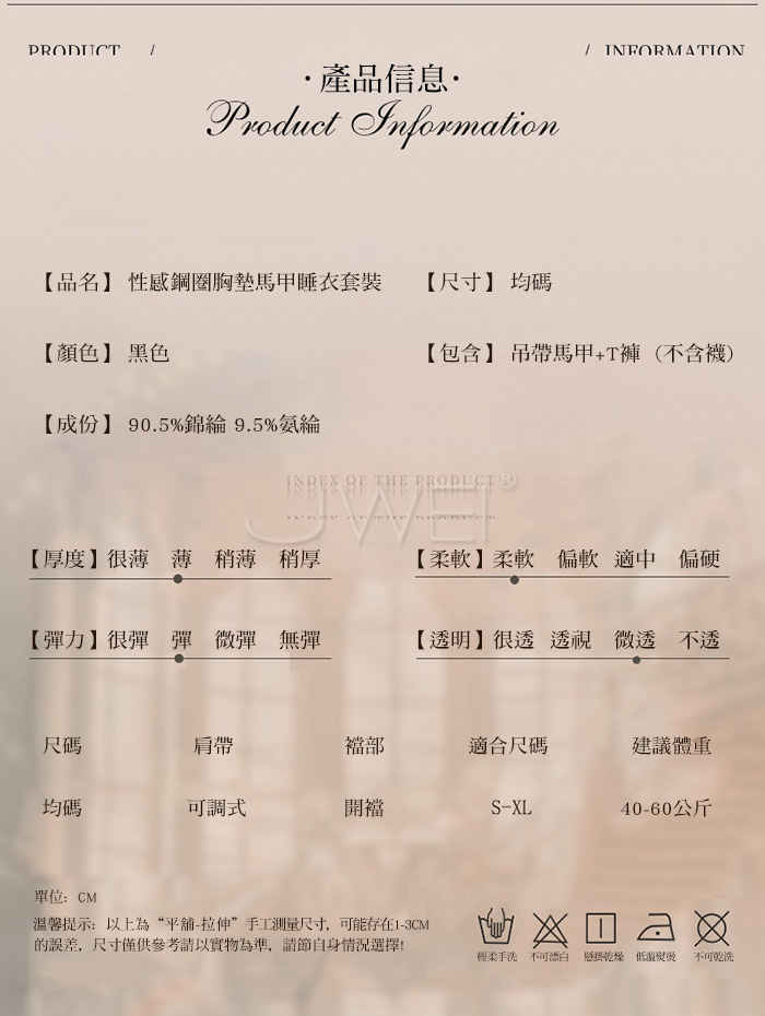 ■內容物:吊帶馬甲+T褲 ■適穿尺寸:FREESIZE ■彈性:彈 ■未撐開平量尺寸正負誤差1~2cm,1吋=2.54cm ■注意事項:基於保障消費者個人衛生,此貼身衣物恕不接受退換貨。 (如為商品本身暇疵,接受七日內換貨,請勿試穿,謝謝您)