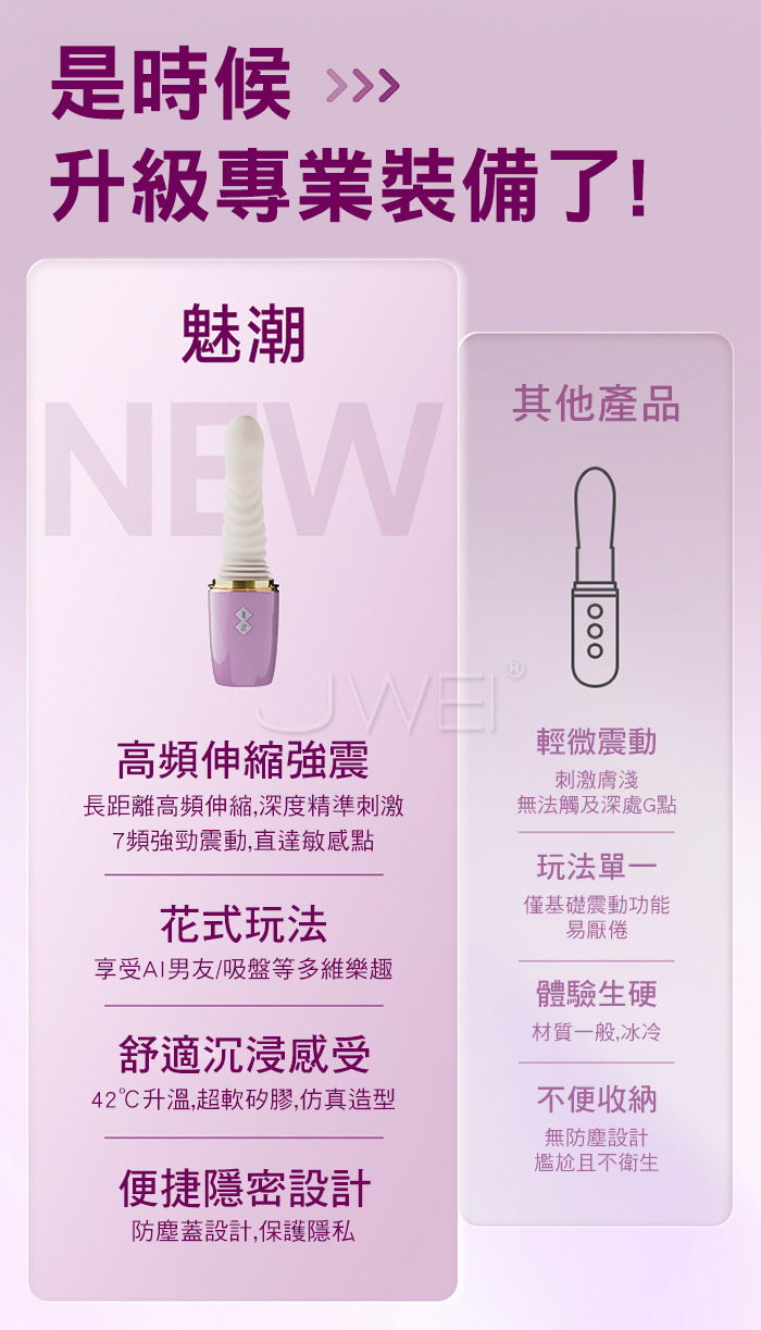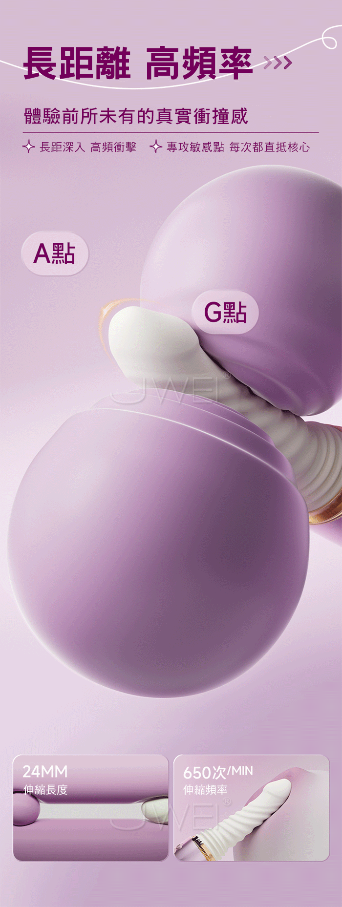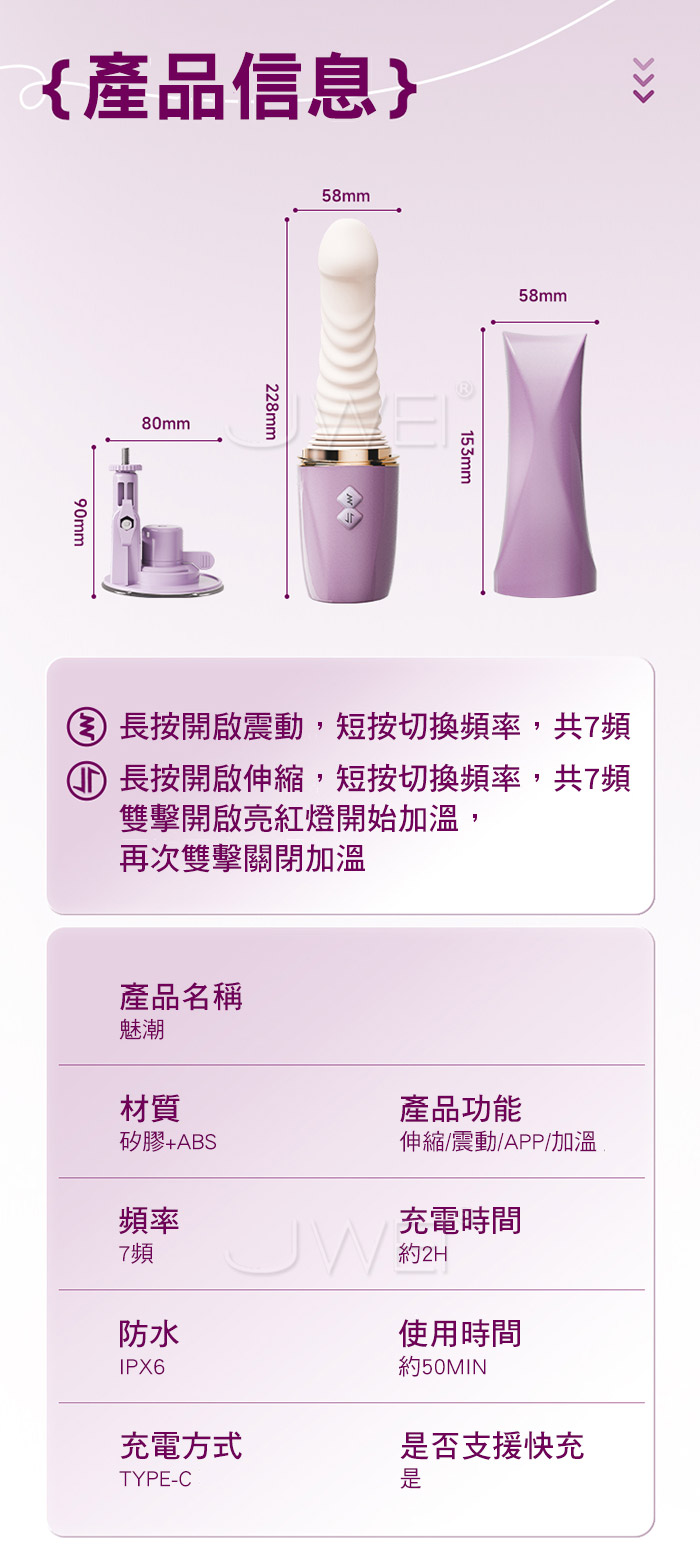 長距離 高頻率,體驗前所未有的真實沖撞感 長距深入高頻衡擊,專攻敏成點每次都直抵核心 強勁震動,酥麻入魂,滿足你對不停歇的快感要求 產品規格 ■尺寸:大小詳如圖片標示 ■材質:矽膠+ABS ■功能:7頻伸縮、7頻震動、APP智控、加溫