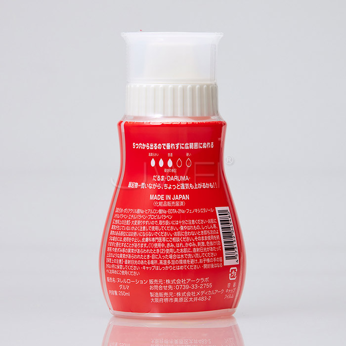 【だるま】日本の縁起物、だるまをパッケージにしました。 5つ穴から出るので広範囲に塗りやすく、柔らかい容器なので液が出しやすい。 スタンダードな中粘度なので使いやすい。 保湿成分のヒアルロン酸を配合。 外装サイズ: 137 ×72 ×72 mm 商品サイズ: 137×72×72mm 商品重量: 250g