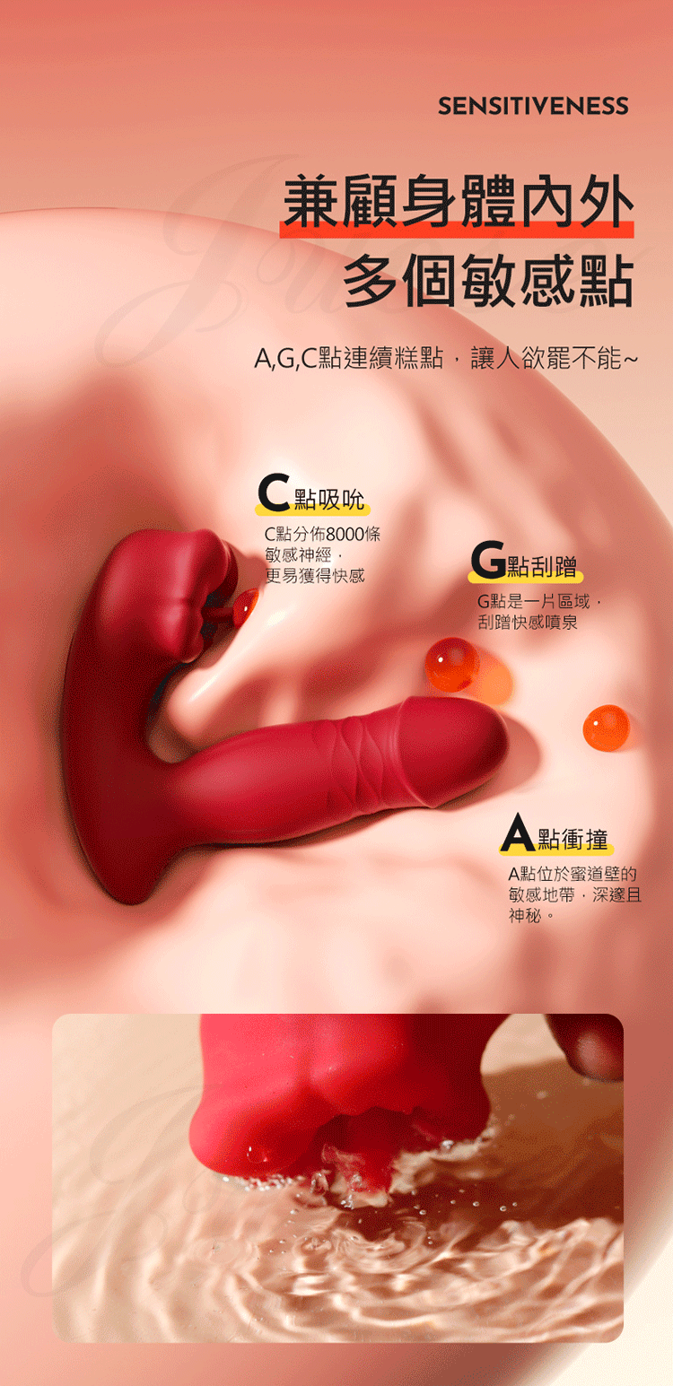 包裹舔咬,快感一浪又一浪,撩撥c點喚醒你沉睡的敏感區。蠕動伸縮蜜道探索,人體工學設計舒適摩擦不撐大。