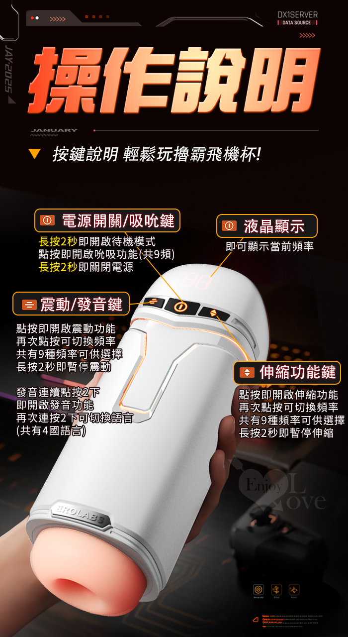 EROLABS 擼霸全配版 ‧ 智能伸縮/吸吮/震動/語音 緊實肉感自慰鍛練杯﹝液晶數碼9頻伸縮X9頻吸吮X9強震+4國淫聲+耳機﹞白色