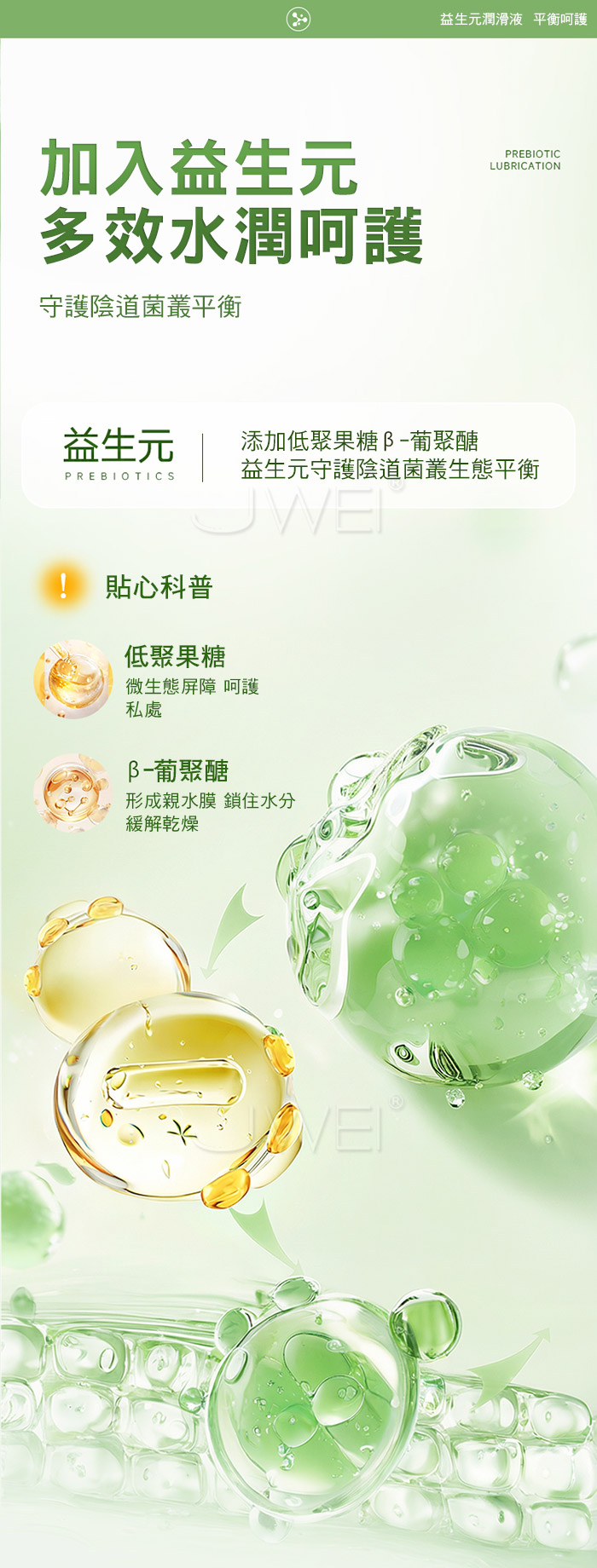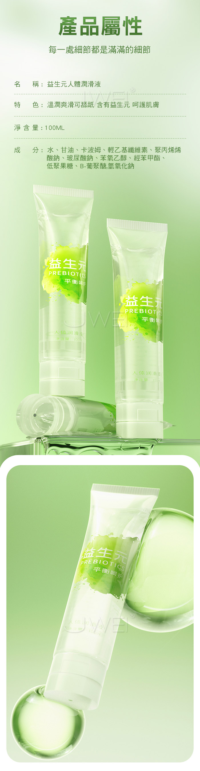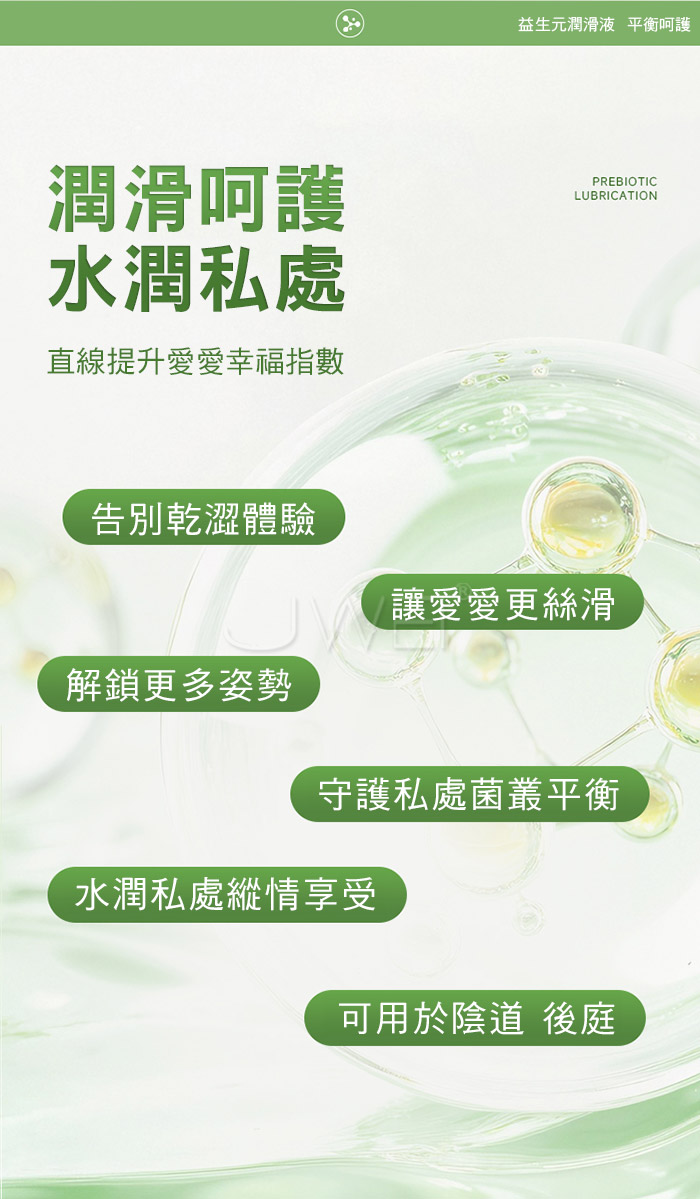 益生元,平衡呵護,守護私處菌叢平衡,暢爽水潤縱情絲滑 添加低聚果糖B-葡聚醣,形成親水膜 鎖住水分 緩解乾燥 澎湃潤澤彷彿自然流動的愛液,喚醒每一寸肌膚的渴望 ●容量:100ml。 ●規格:溫潤爽滑可舔舐 含有益生元 呵護肌膚。 ●性質:水溶性配方,溫和水潤且輕盈。