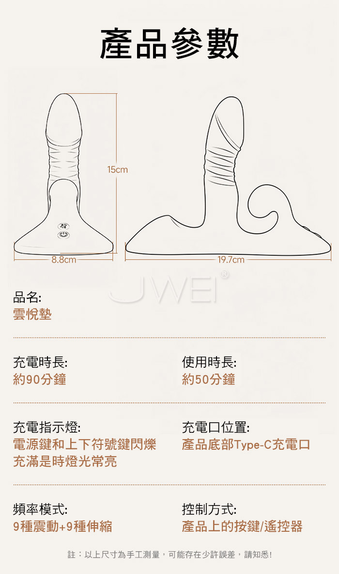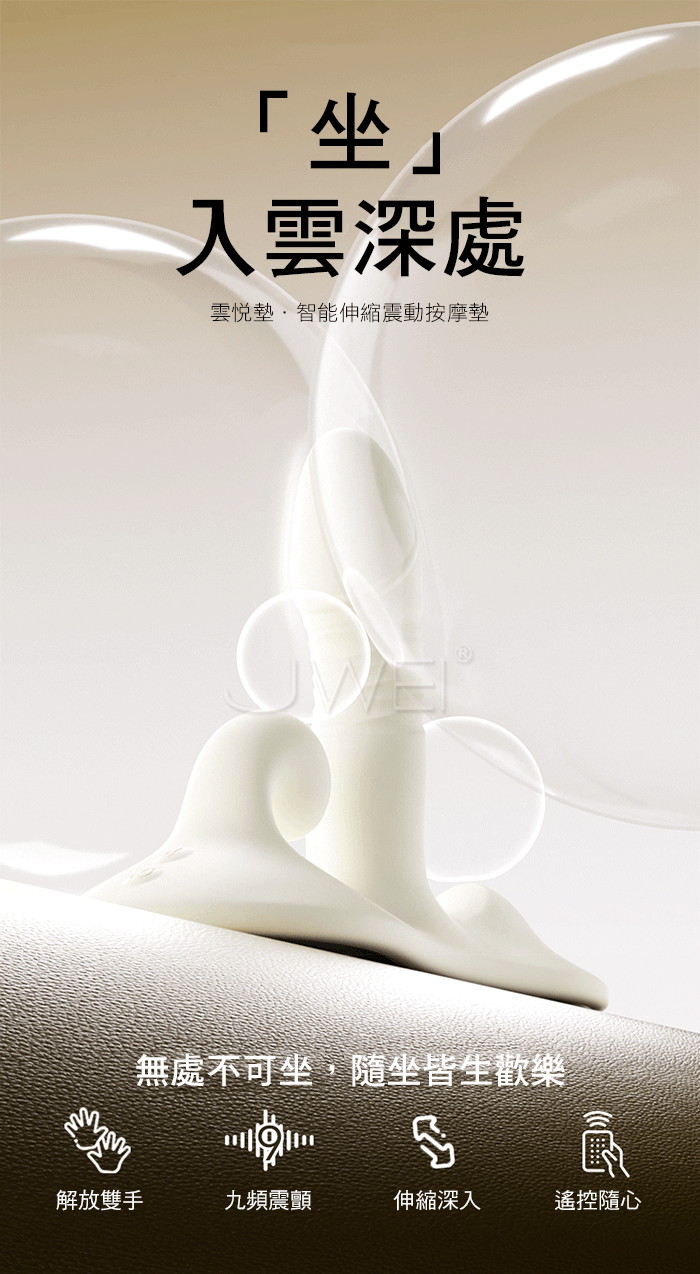 坐入雲深處~雲悦墊智能伸縮震動按摩墊,無處不可坐,隨坐皆生歡樂 深入!更深入!!節奏由你掌控,搭載伸縮+震動雙重結構 前後配置雙馬達,一震一動之間,把「快感」升為身體的旋律 ■尺寸:大小詳如圖片標示 ■材質:矽膠+ABS ■功能:9頻震動、9種伸縮、無線遙控